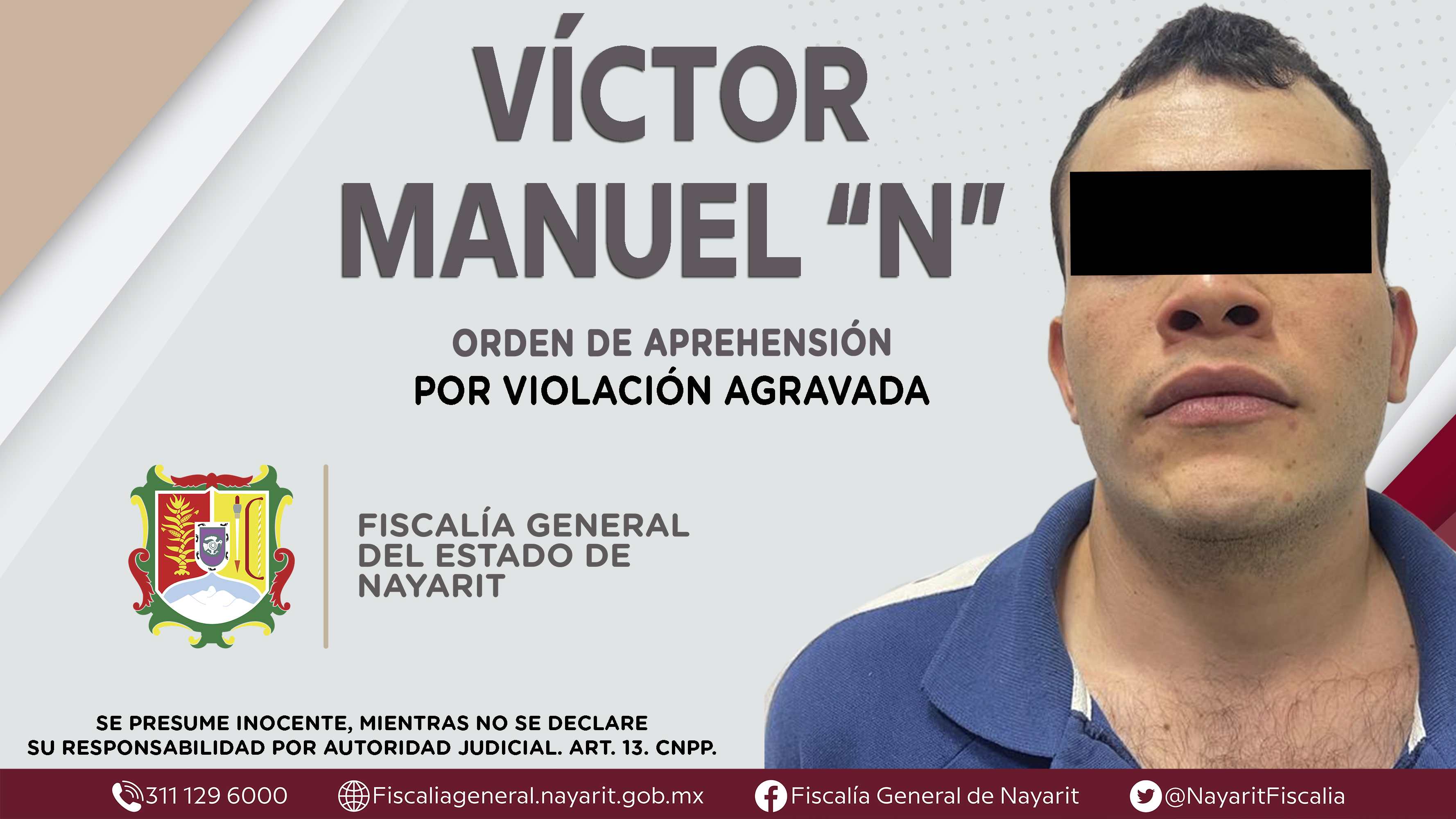 Elementos de la Agencia de Investigación Criminal dieron cumplimiento a una orden de aprehensión en la ciudad de Tepic contra Víctor Manuel “N”, por su presunta participación en hechos que bajo la apreciación de la ley configuran el delito de vi...