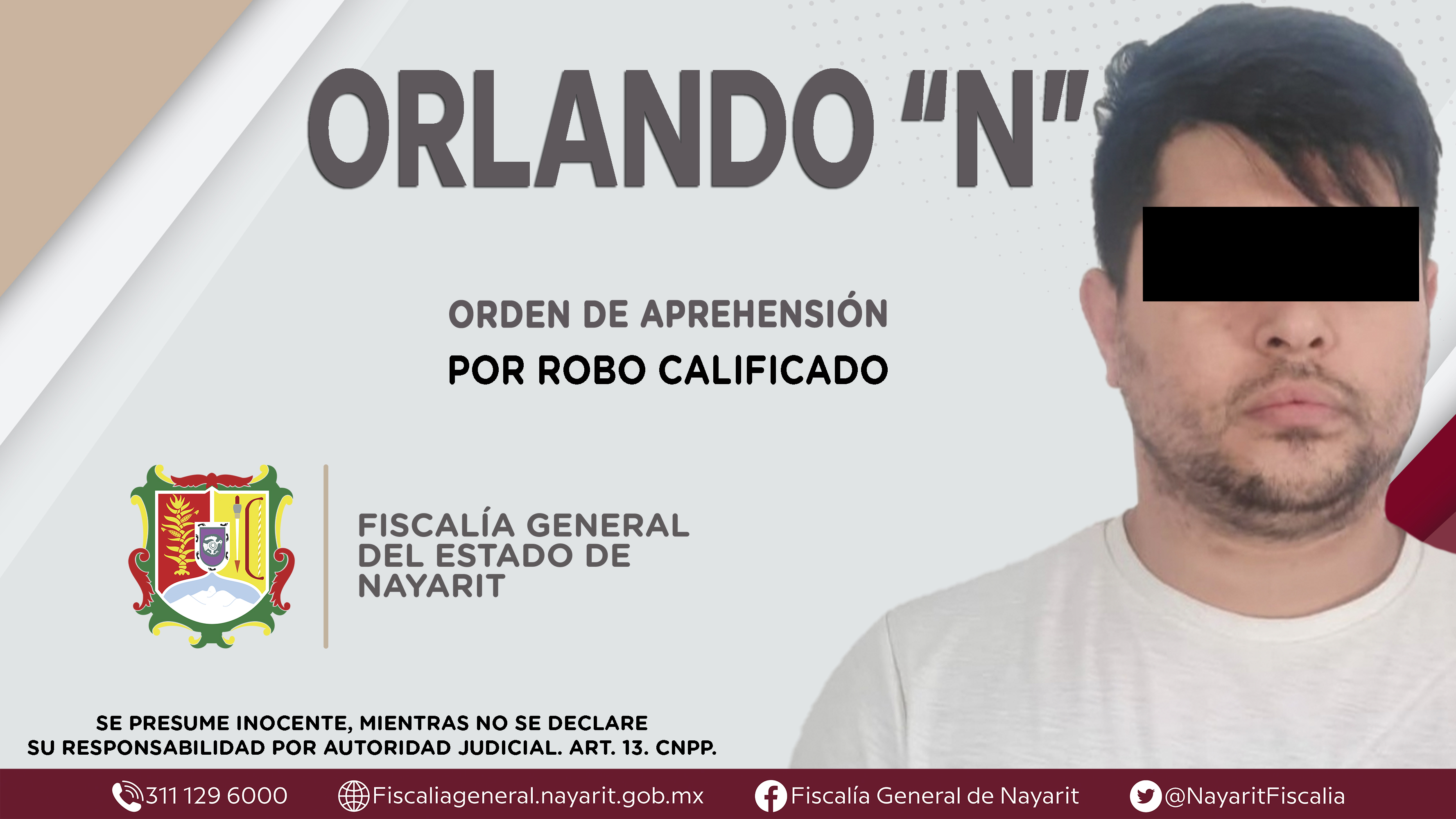 Elementos de la Agencia de Investigación Criminal dieron cumplimiento a una orden de aprehensión en la ciudad de Tepic contra Orlando “N”, por su presunta participación en hechos que bajo la apreciación de la ley configuran el delito de robo cali...