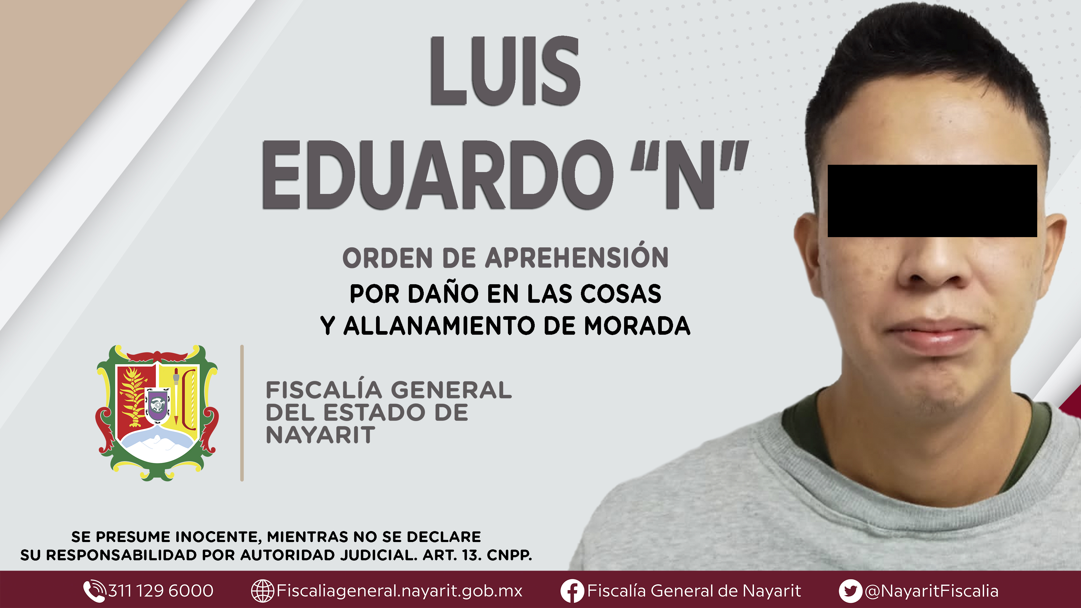 Elementos de la Agencia de Investigación Criminal de Nayarit ejecutaron una orden de aprehensión en la ciudad de Tepic contra Luis Eduardo “N”, por su presunta participación en hechos que según apreciación de la ley encuadran los delitos de dañ...