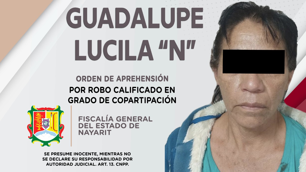 Personal de la Agencia de Investigación Criminal de Nayarit ejecutó una orden de aprehensión contra Guadalupe Lucila “N”, por su probable responsabilidad penal en hechos que para la ley configuran el delito de robo calificado en grado de copartici...