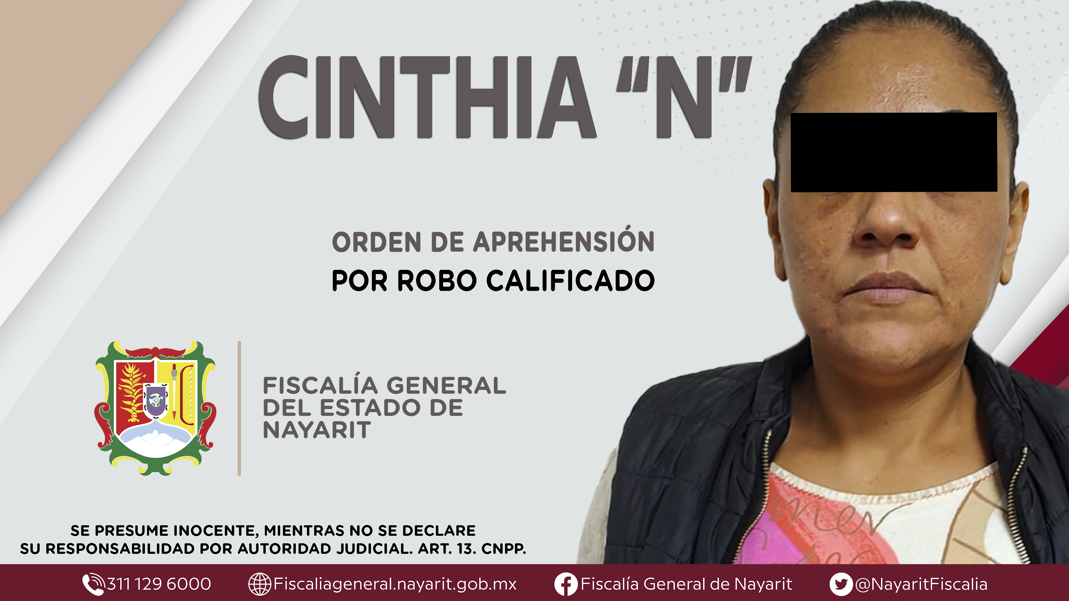 La Fiscalía General de Nayarit a través de la Agencia de Investigación Criminal dio cumplimiento a una orden de aprehensión en la ciudad de Tepic contra Cinthia “N”, por su presunta participación en hechos que según apreciación de la ley encua...