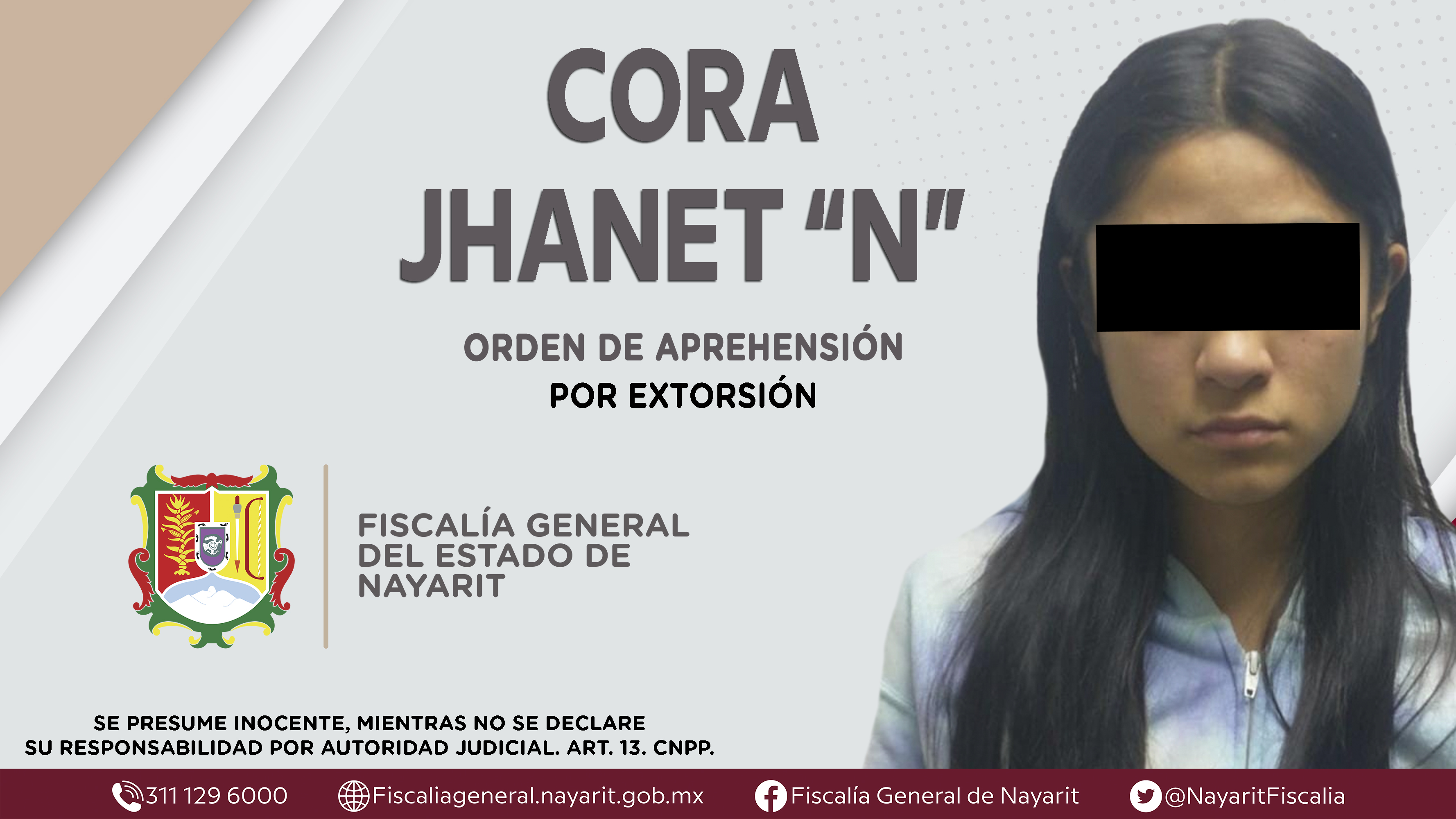 La Fiscalía General del Estado a través de la Agencia de Investigación Criminal cumplimentó una orden de aprehensión en la capital nayarita contra Cora Jhanet “N”, por su presunta participación en hechos que bajo apreciación de la ley configur...