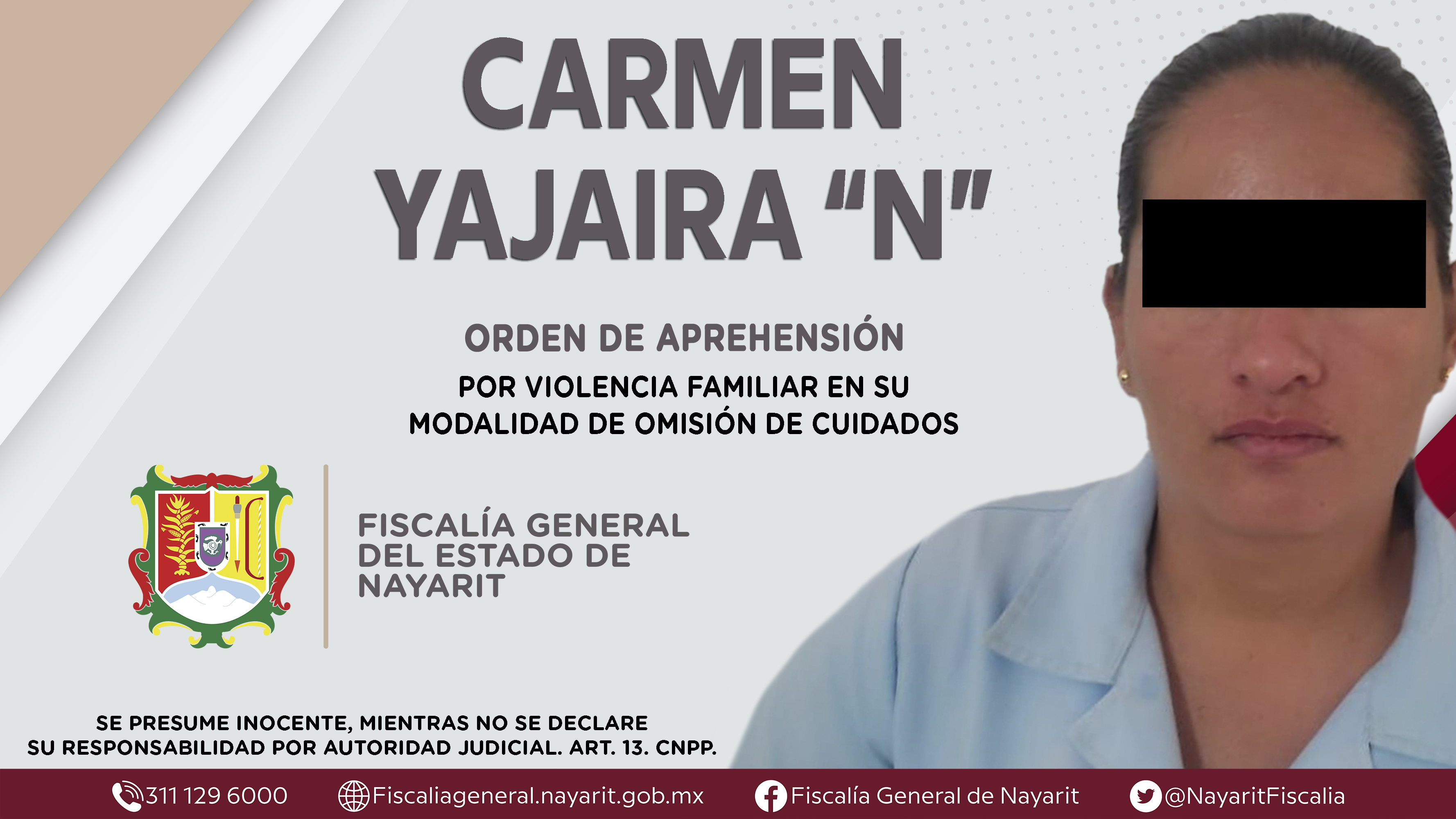 La Fiscalía General de Nayarit a través de la Agencia de Investigación Criminal dio cumplimiento a una orden de aprehensión en el municipio de Santiago Ixcuintla contra Carmen Yajaira “N”, por su presunta participación en hechos que según aprec...