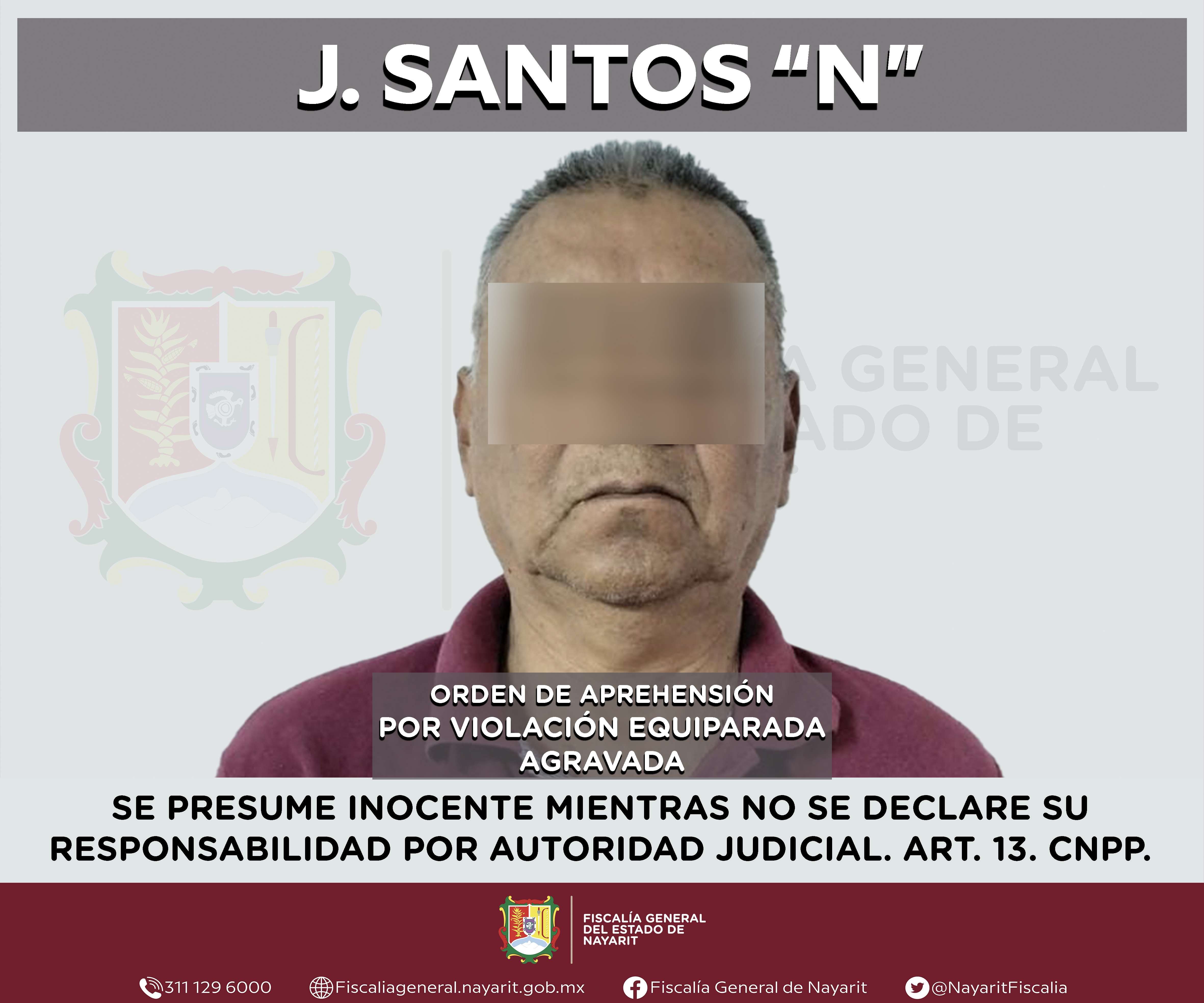 Elementos de la Agencia de Investigación Criminal de Nayarit ejecutaron una orden de aprehensión en la ciudad de Tepic contra J. Santos “N”, por su probable participación en hechos que para la ley configuran el delito de violación equiparada agra...
