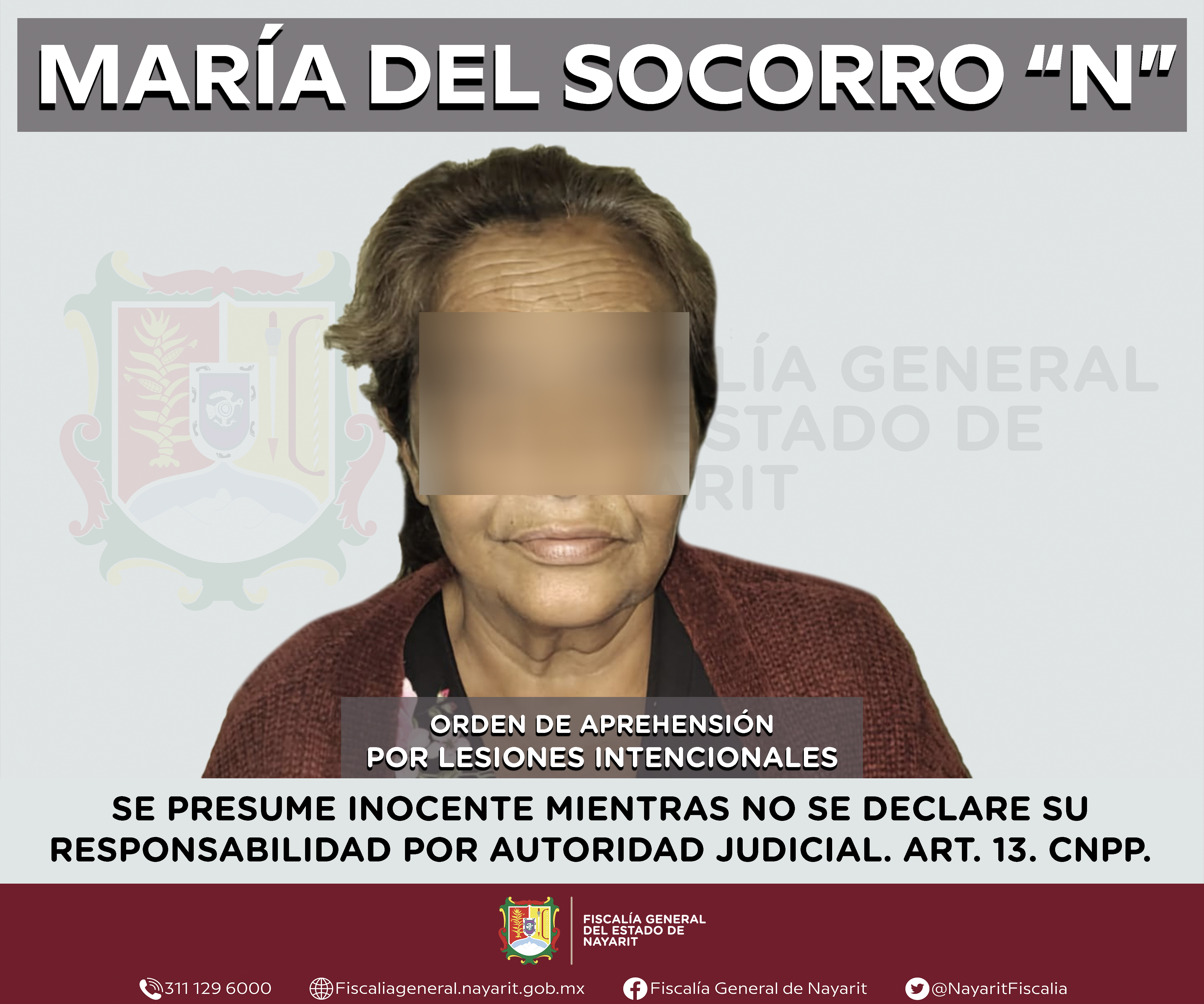 La Fiscalía General de Nayarit a través de la Agencia de Investigación Criminal ejecutó una orden de aprehensión en el municipio de Acaponeta contra María del Socorro “N”, por su presunta participación en hechos que según apreciación de la l...