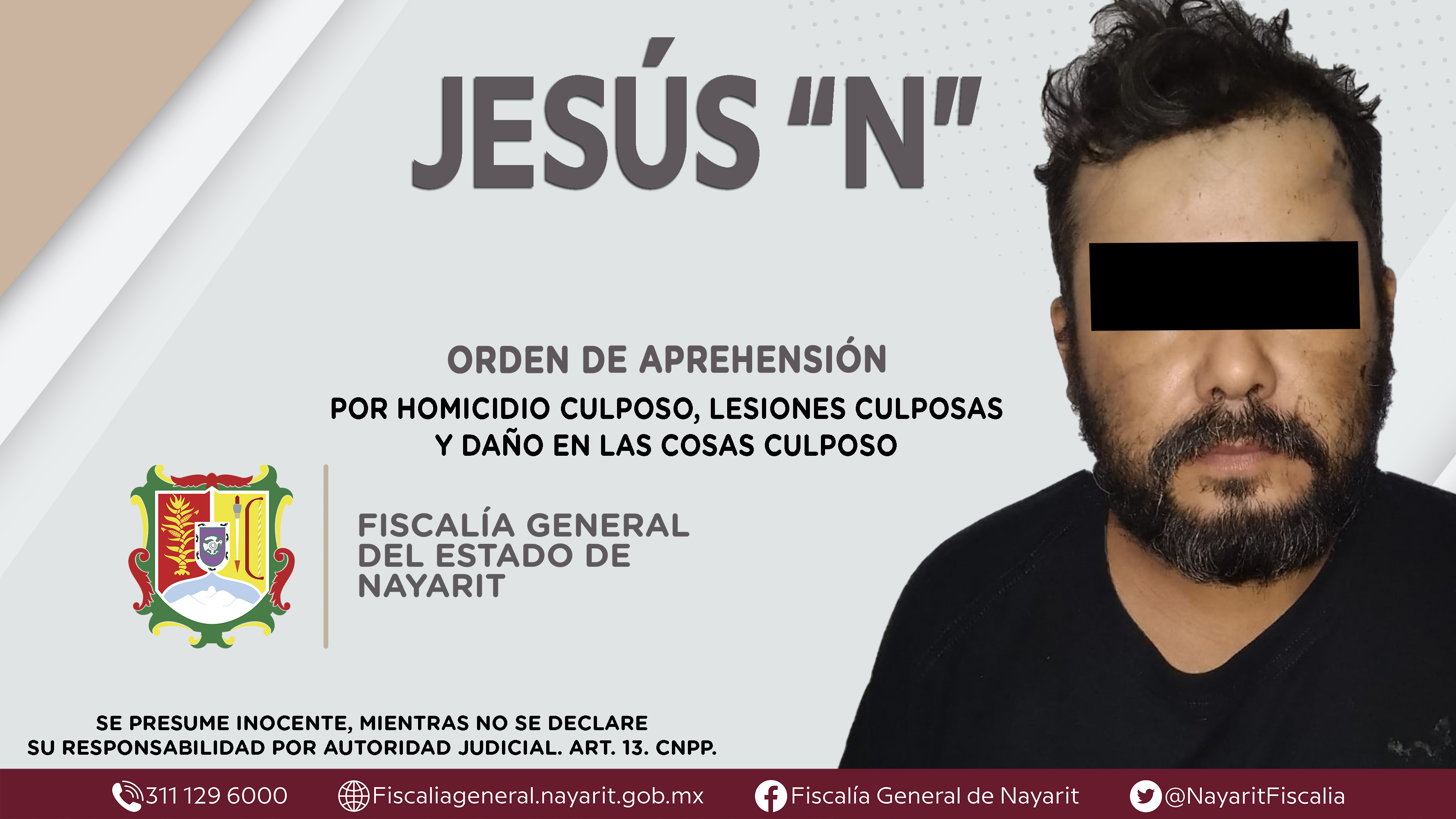 La Fiscalía General de Nayarit a través de la Agencia de Investigación Criminal ejecutó una orden de aprehensión contra Jesús “N”, por su presuntiva responsabilidad penal en hechos que la ley califica como delitos de homicidio culposo, lesiones...