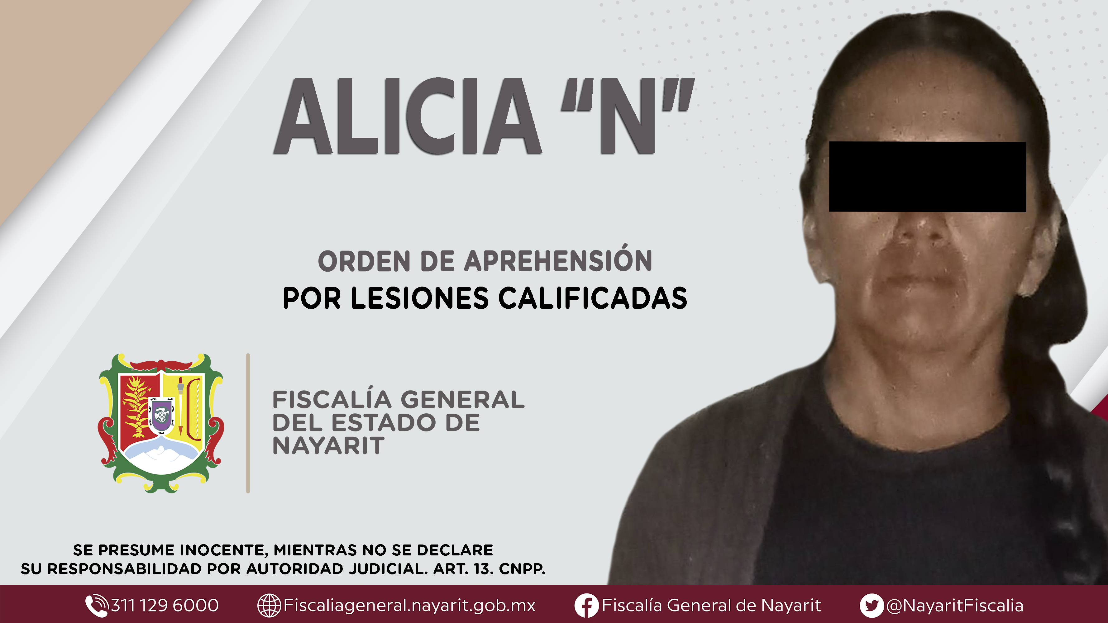 La Fiscalía General del Estado a través de la Agencia de Investigación Criminal dio cumplimiento a una orden de aprehensión en la localidad de Francisco I. Madero -Puga-, municipio de Tepic contra Alicia “N”, por su presunta participación ...