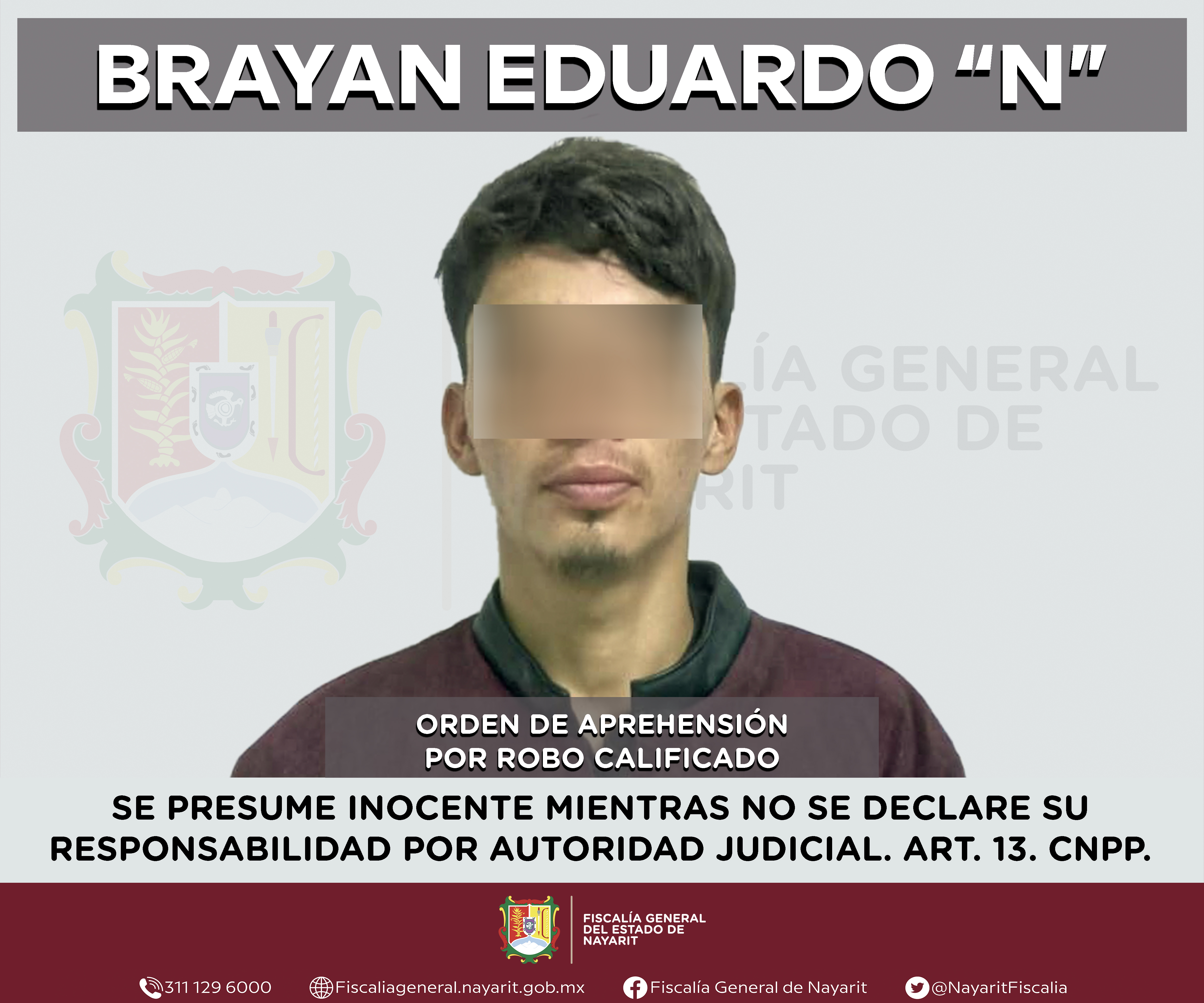 Elementos de la Agencia de Investigación Criminal de Nayarit ejecutaron una orden de aprehensión en la capital nayarita contra Brayan Eduardo “N”, por su presunta participación en hechos que según apreciación de la ley encuadran el delito de rob...