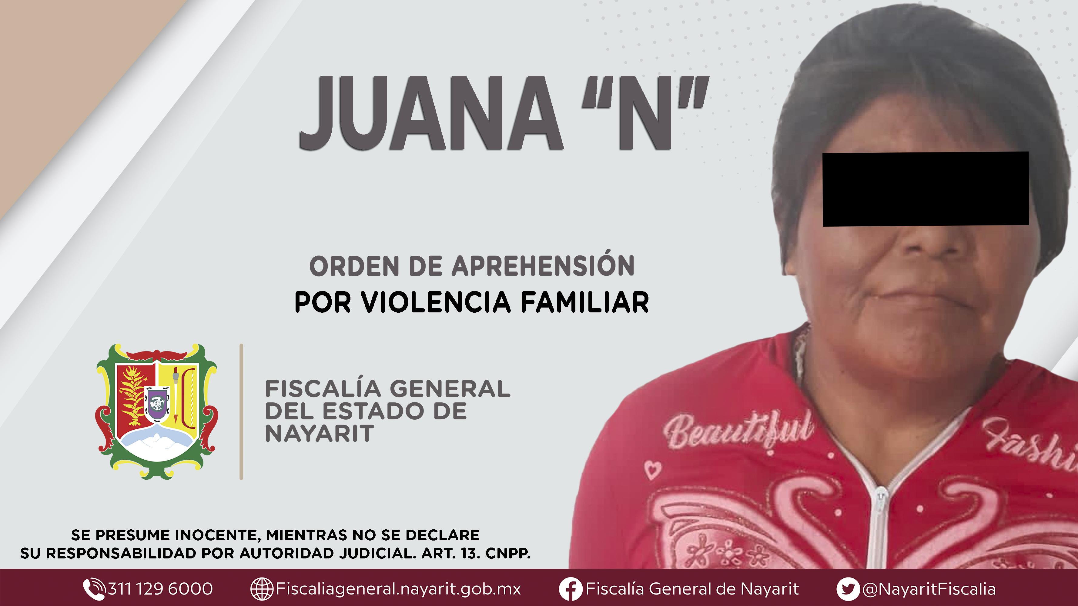 Elementos de la Agencia de Investigación Criminal de Nayarit ejecutaron una orden de aprehensión en el municipio de Ruiz contra Juana “N”, por su presunta participación en hechos que según apreciación de la ley configuran el delito de violencia ...