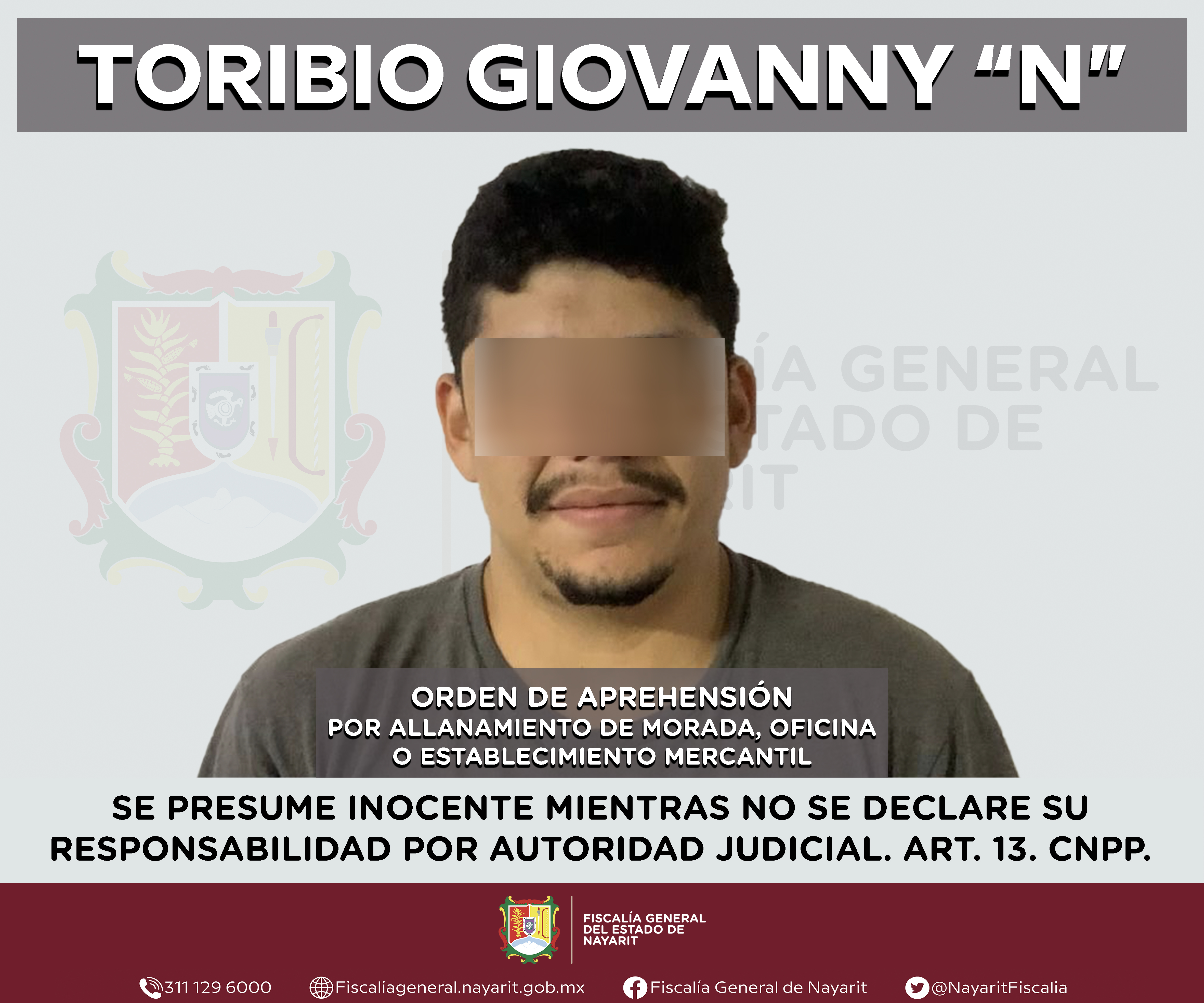 La Fiscalía General de Nayarit a través de la Agencia de Investigación Criminal ejecutó una orden de aprehensión en la capital nayarita contra Toribio Giovanny “N”, por su probable participación en hechos que para la ley configuran el delito de...