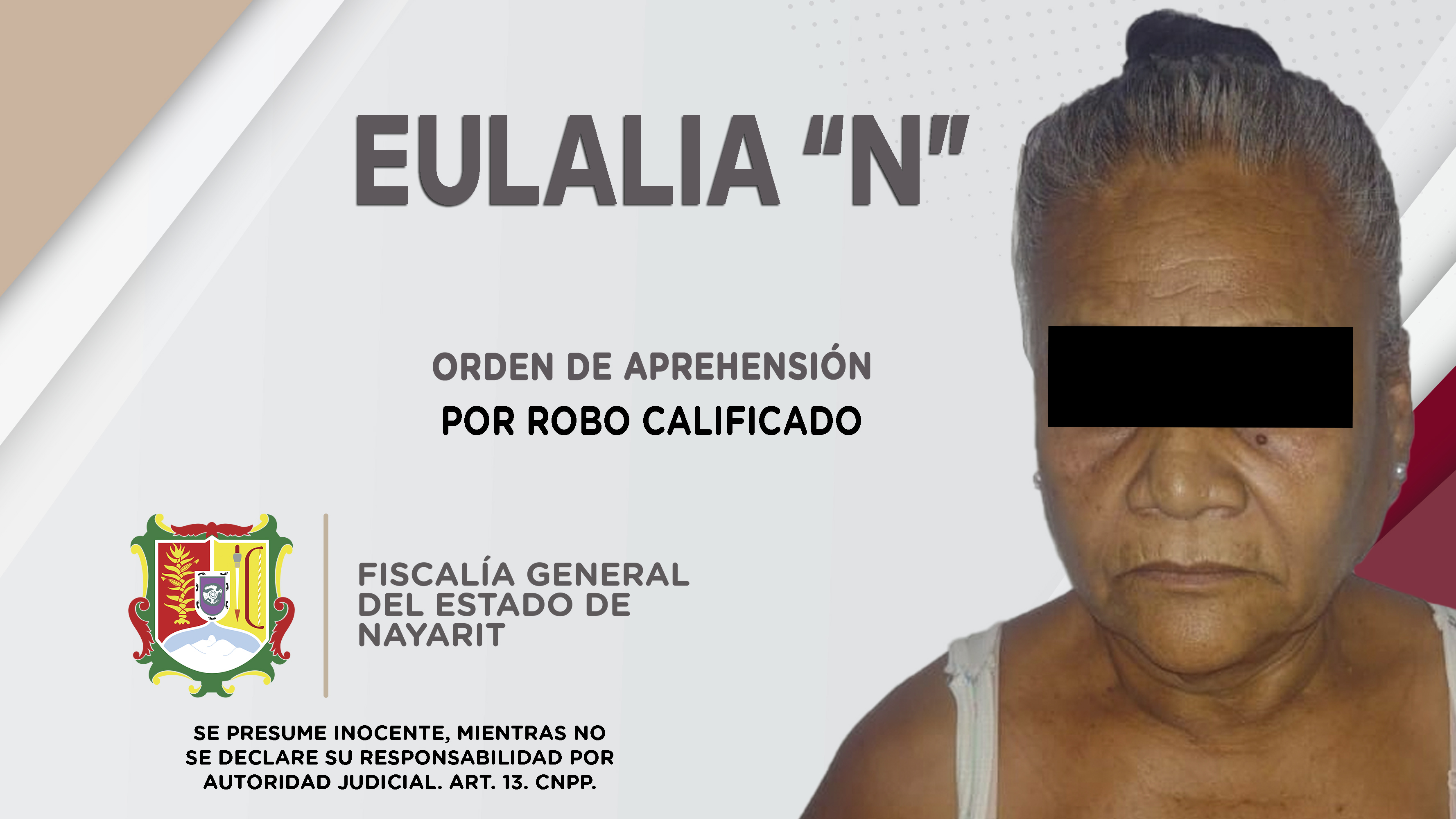 Elementos de la Agencia de Investigación Criminal de Nayarit ejecutaron una orden de reaprehensión en el poblado Pozo de Ibarra, municipio de Santiago Ixcuintla contra Eulalia “N”, por su probable participación en hechos que según la ley configur...