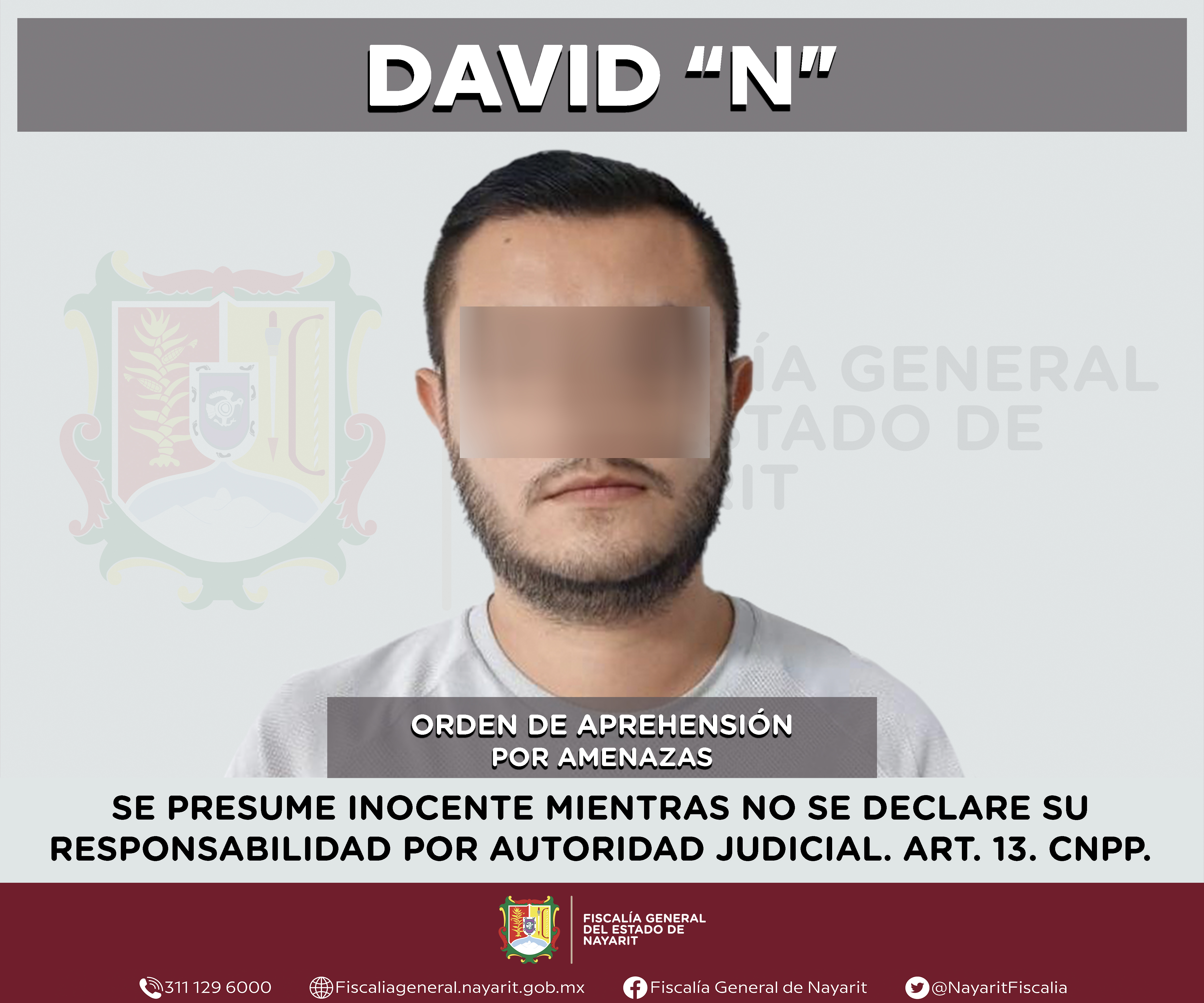La Fiscalía General de Nayarit a través de la Agencia de Investigación Criminal ejecutó una orden de aprehensión en la ciudad de Tepic contra David “N”, por su probable participación en hechos que para la ley configuran el delito de amenazas, c...