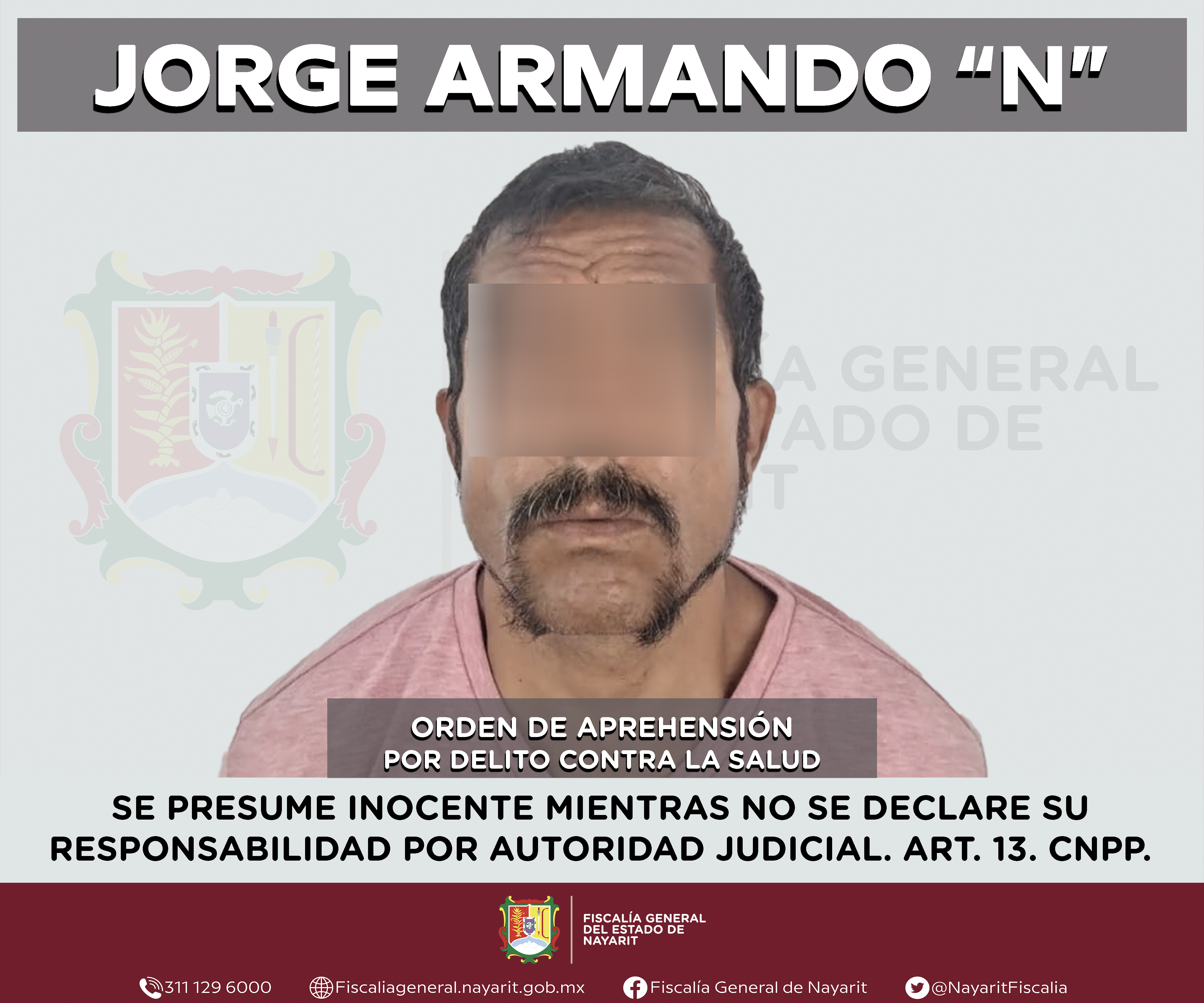 La Fiscalía General de Nayarit a través de la Agencia de Investigación Criminal ejecutó una orden de aprehensión contra Jorge Armando “N”, por su probable participación en hechos que para la ley configuran el delito contra la salud en su modali...