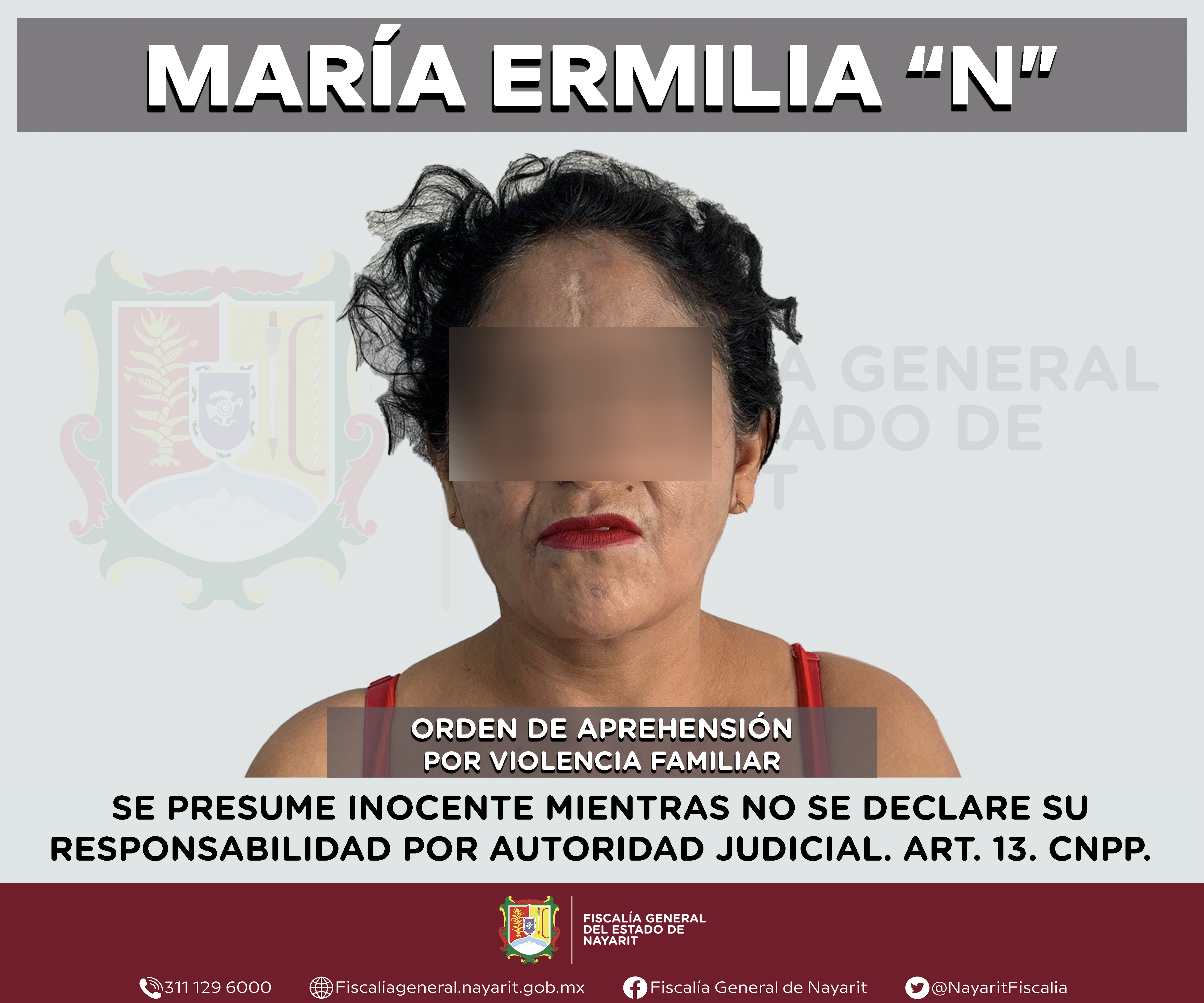 La Fiscalía General de Nayarit a través de la Agencia de Investigación Criminal ejecutó una orden de aprehensión en la ciudad de Tepic contra María Ermilia “N”, por su probable participación en hechos que para la ley configuran el delito de vi...