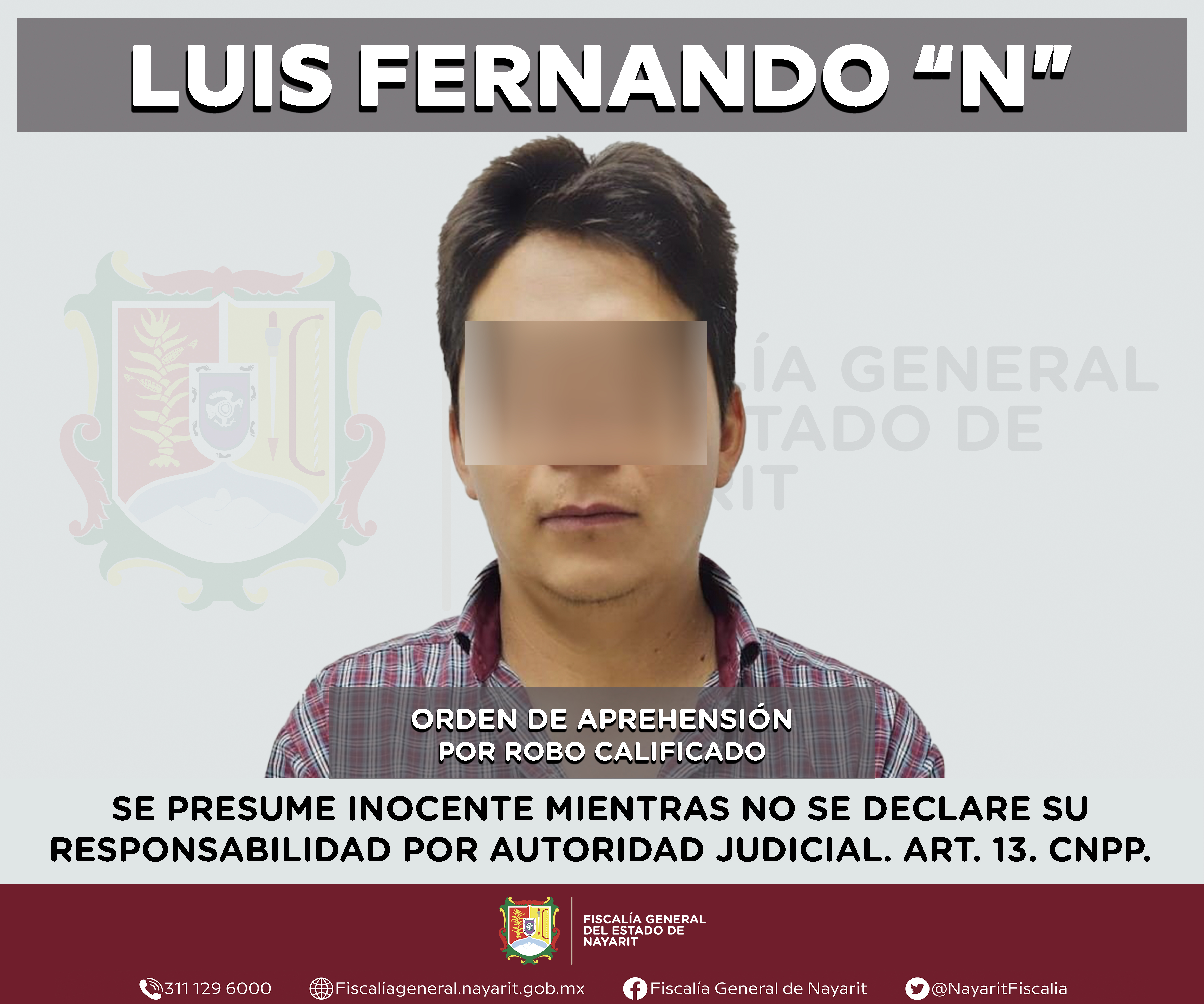La Fiscalía General de Nayarit a través de la Agencia de Investigación Criminal ejecutó una orden de aprehensión en la ciudad de Tepic contra Luis Fernando “N”, por su probable participación en hechos que para la ley configuran el delito de rob...