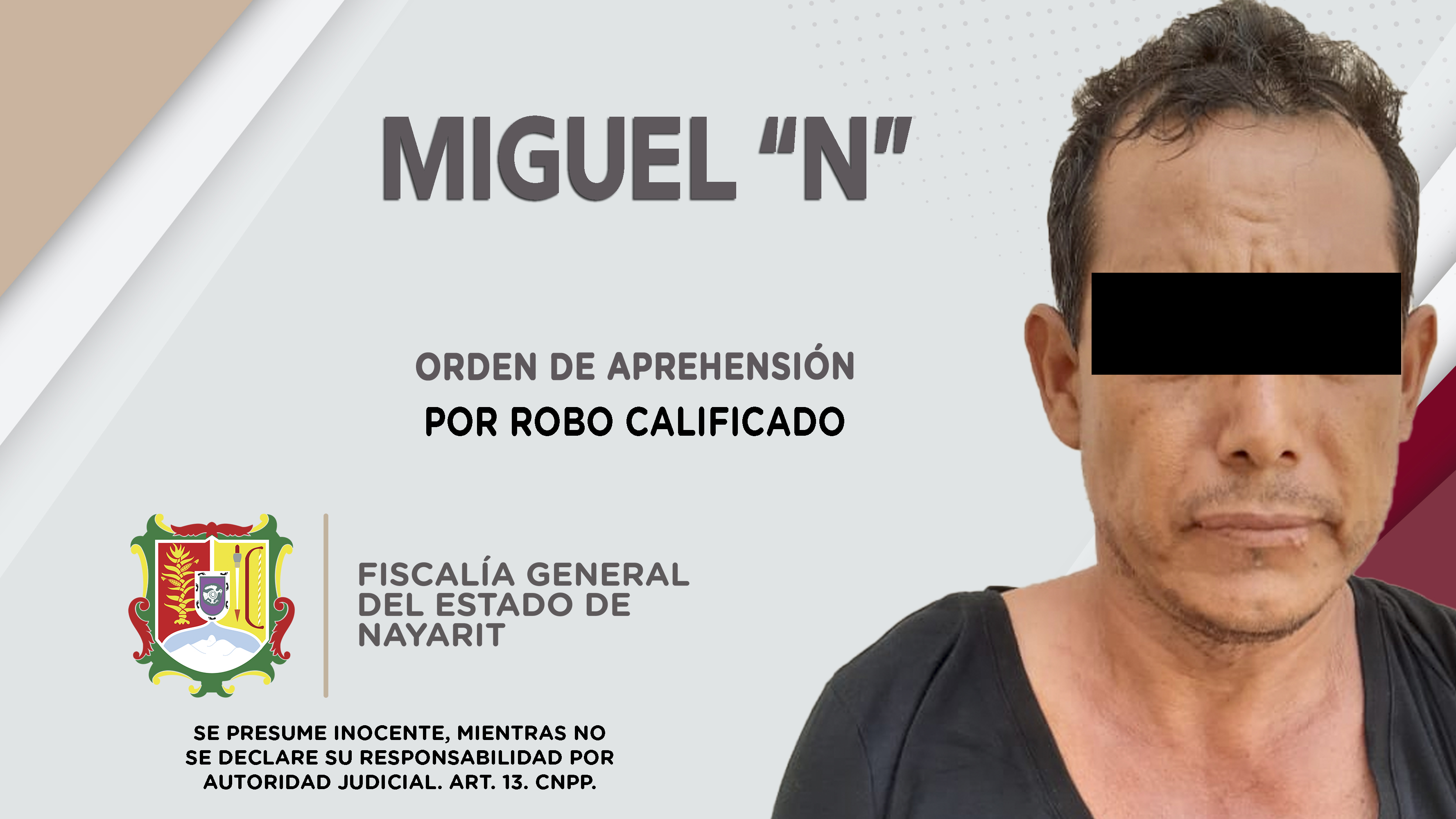 Fiscalía General de Nayarit a través de la Agencia de Investigación Criminal, ejecutó una orden de aprehensión en la localidad Las Varas, municipio de Compostela contra Miguel “N”, por su probable participación en hechos que la ley califica com...