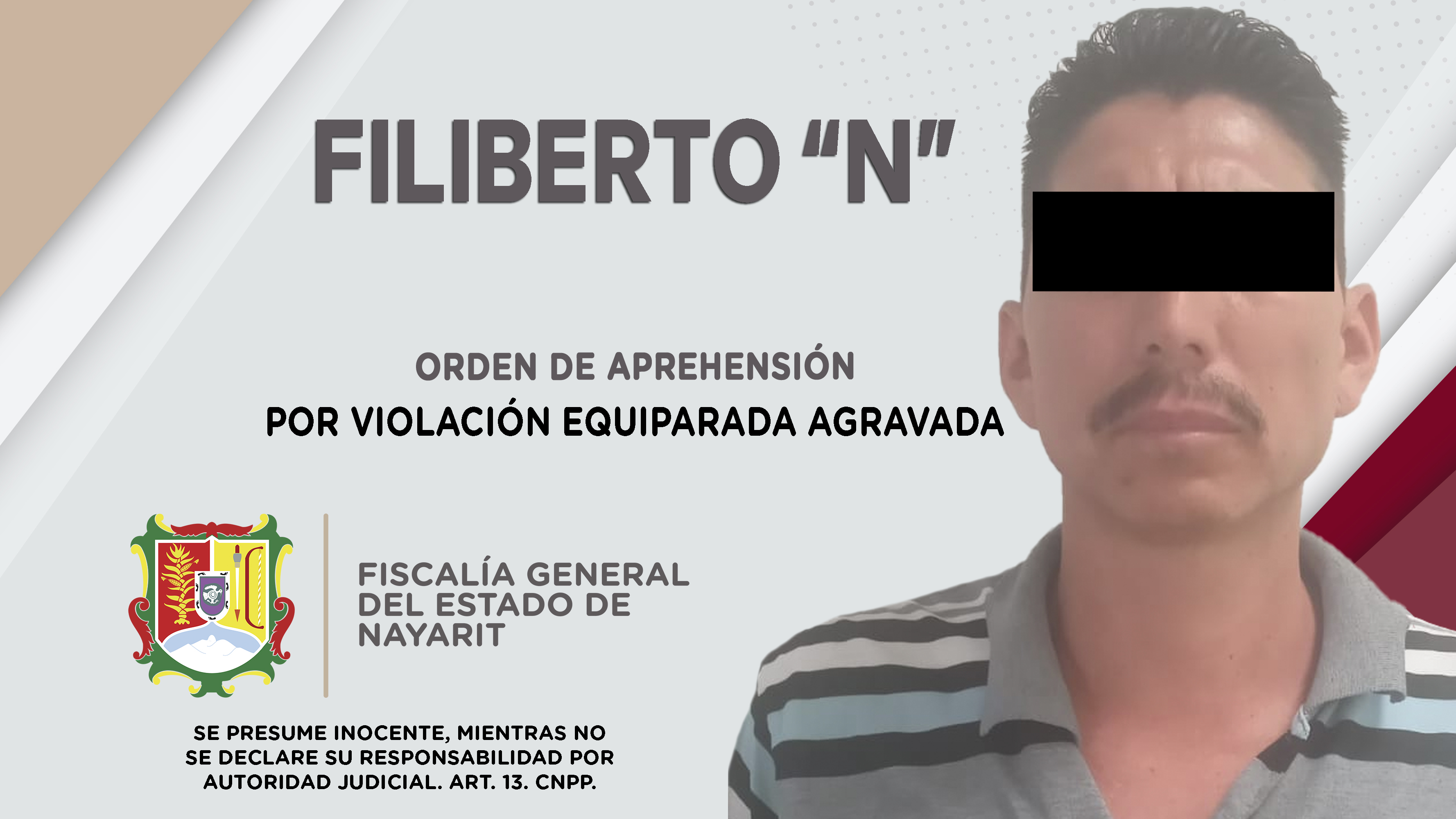 Personal de la Agencia de Investigación Criminal de Nayarit dio cumplimiento a una orden de aprehensión en la capital nayarita contra Filiberto “N”, por su presuntiva responsabilidad penal en hechos que la ley juzga como delito de violación equipa...