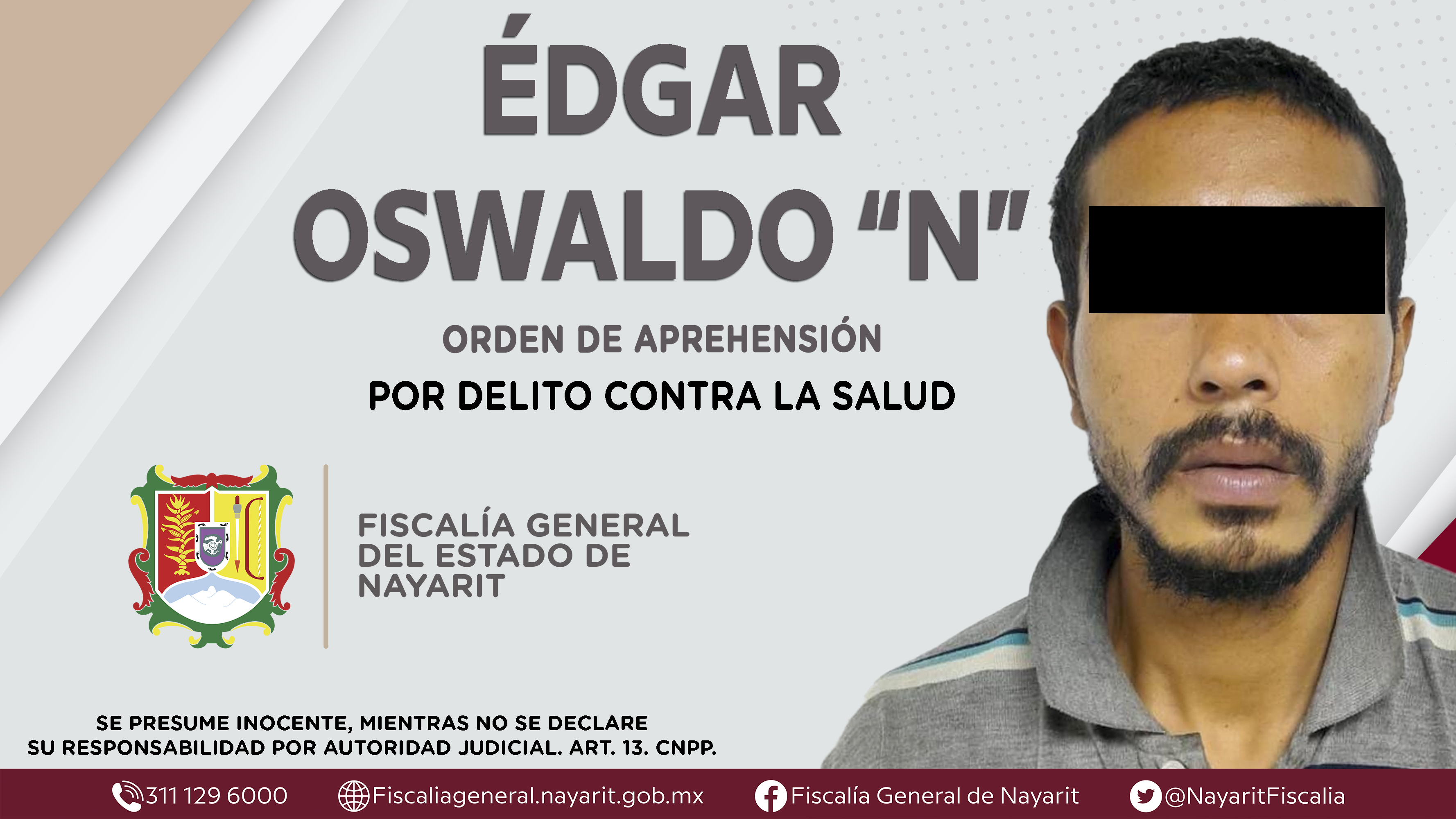 La Fiscalía General del Estado a través de la Agencia de Investigación Criminal dio cumplimiento a una orden de aprehensión en la capital nayarita contra Édgar Oswaldo “N”, por su presunta participación en hechos que según valoración de la le...