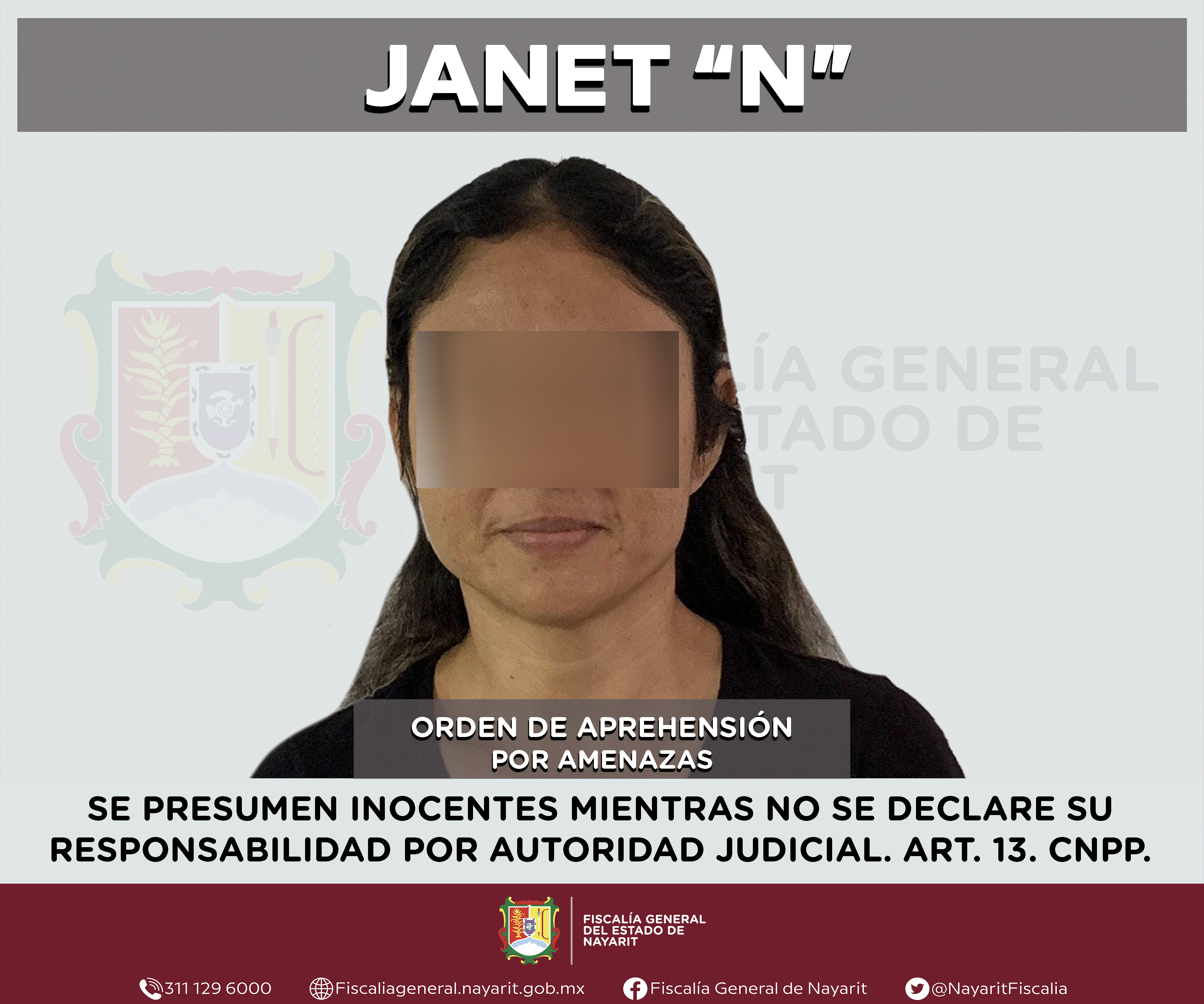 Elementos de la Agencia de Investigación Criminal de Nayarit ejecutaron una orden de aprehensión en la capital nayarita contra Janet “N”, por su presunta participación en hechos que según apreciación de la ley encuadran el delito de amenazas, co...
