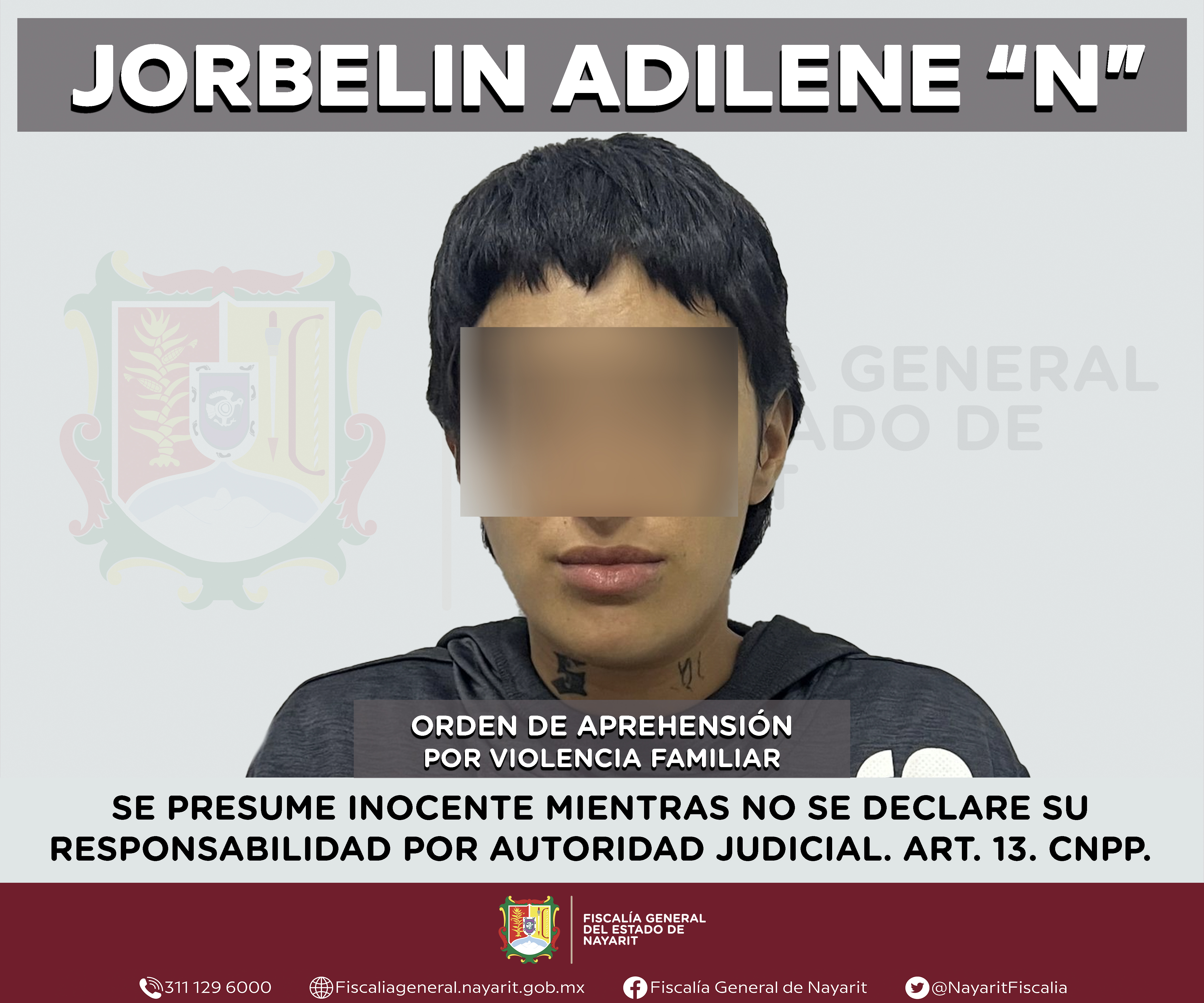 Elementos de la Agencia de Investigación Criminal cumplimentaron una orden de aprehensión en la ciudad de Tepic en contra de Jorbelin Adilene “N”, por su probable participación en hechos que la ley tipifica como delito de violencia familiar, comet...