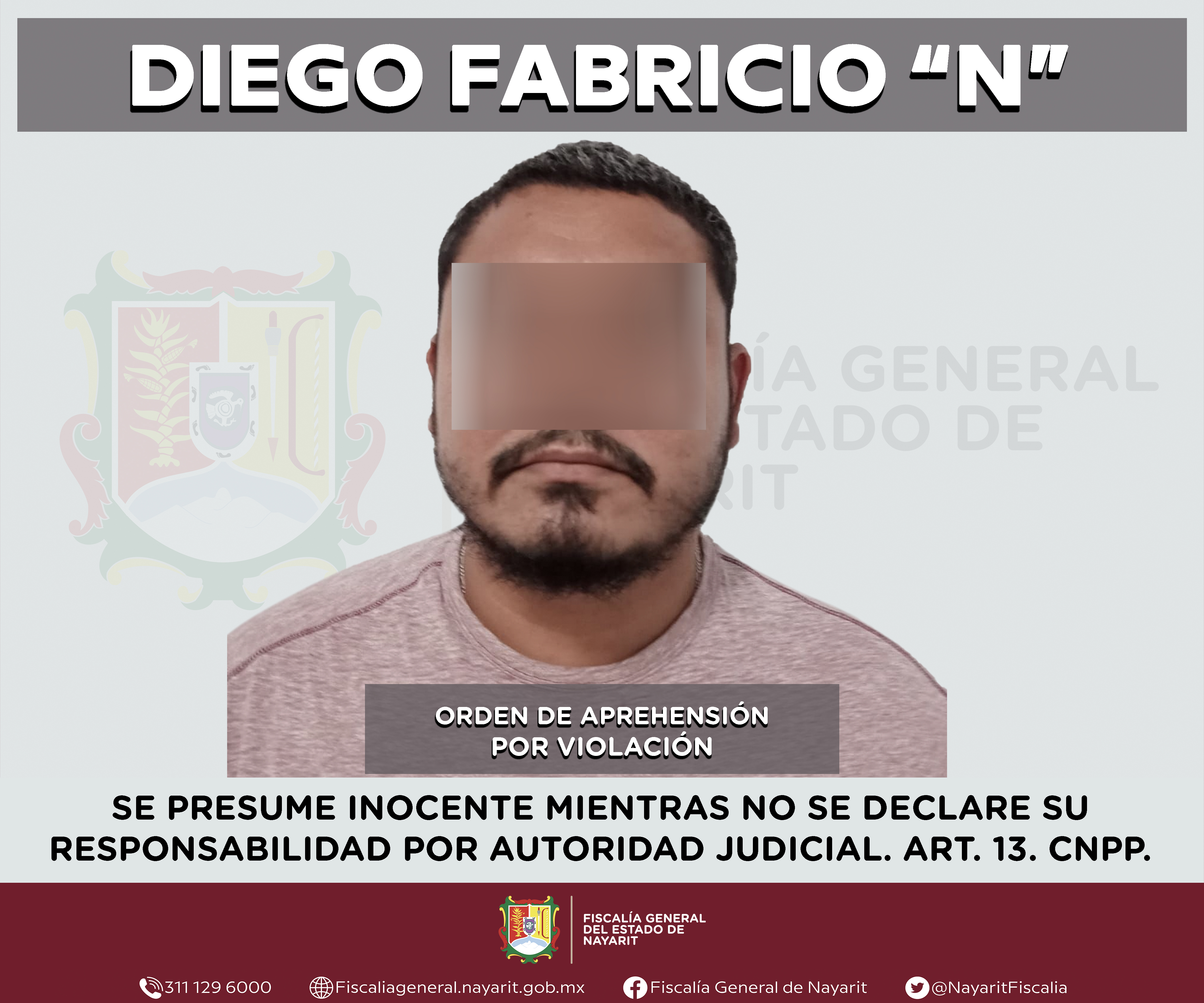 La Fiscalía General del estado de Nayarit informa que elementos de la Agencia de Investigación Criminal ejecutaron una orden de aprehensión en la localidad Lima de Abajo, municipio de Compostela contra Diego Fabricio “N”, por su presunta participa...