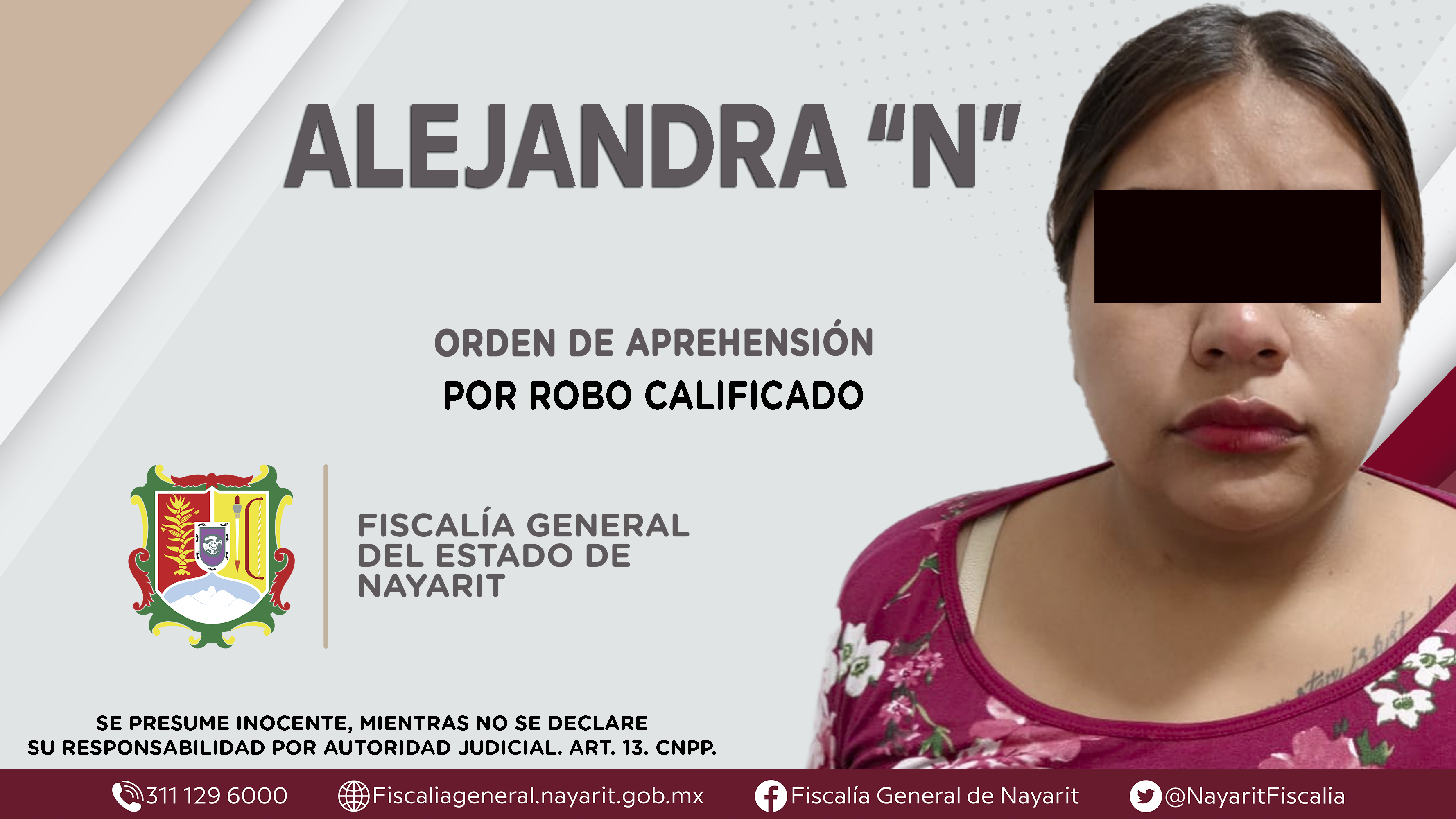 Elementos de la Agencia de Investigación Criminal dieron cumplimiento a una orden de aprehensión en el municipio de Xalisco contra Alejandra “N”, por su probable participación en hechos que la ley juzga como delito de robo calificado, cometido en ...