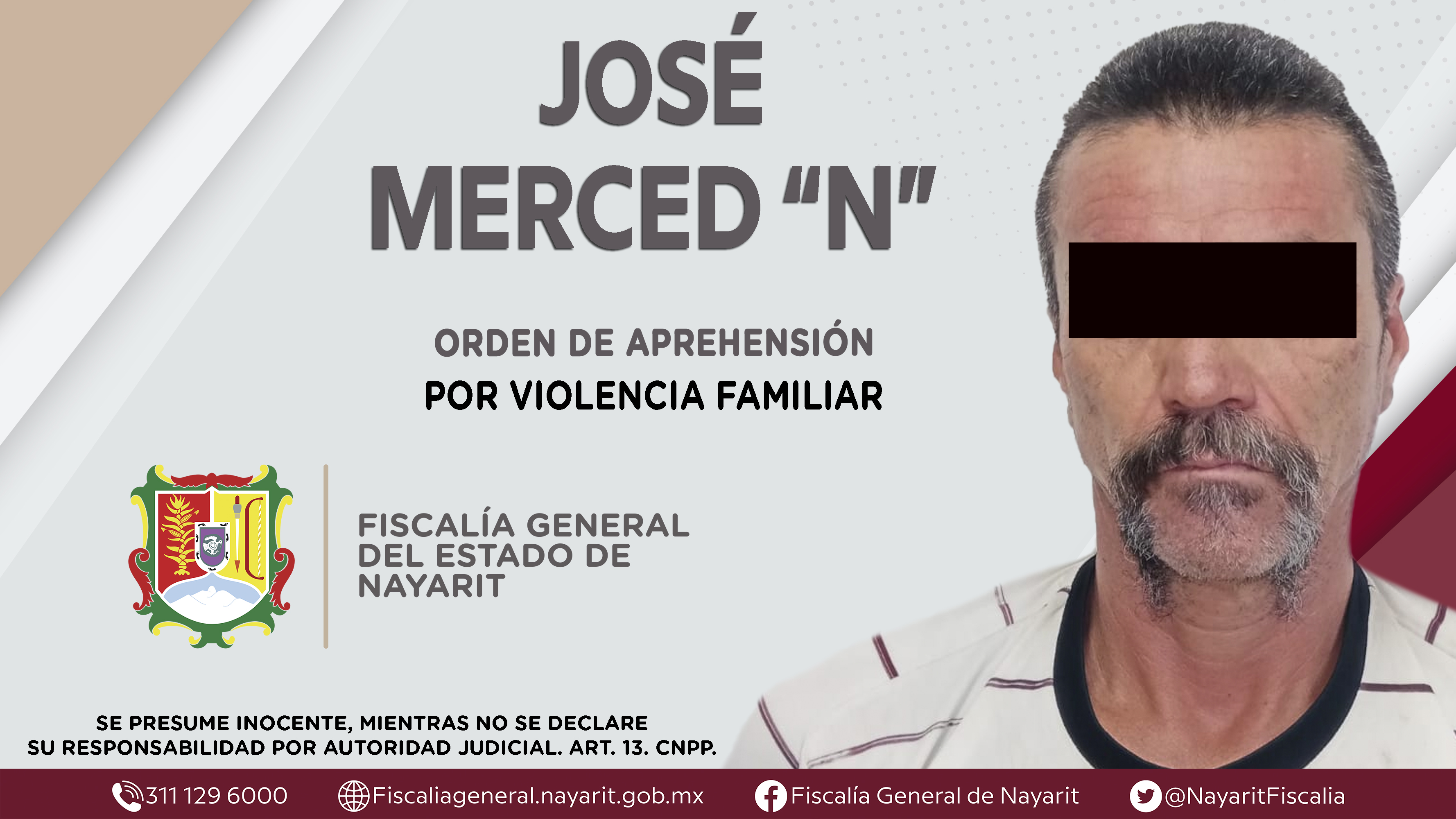 La Fiscalía General de Nayarit a través de la Agencia de Investigación Criminal aprehendió en la ciudad de Tepic a José Merced “N”, por su presunta participación en hechos que según valoración de la ley encuadran el delito de violencia famili...
