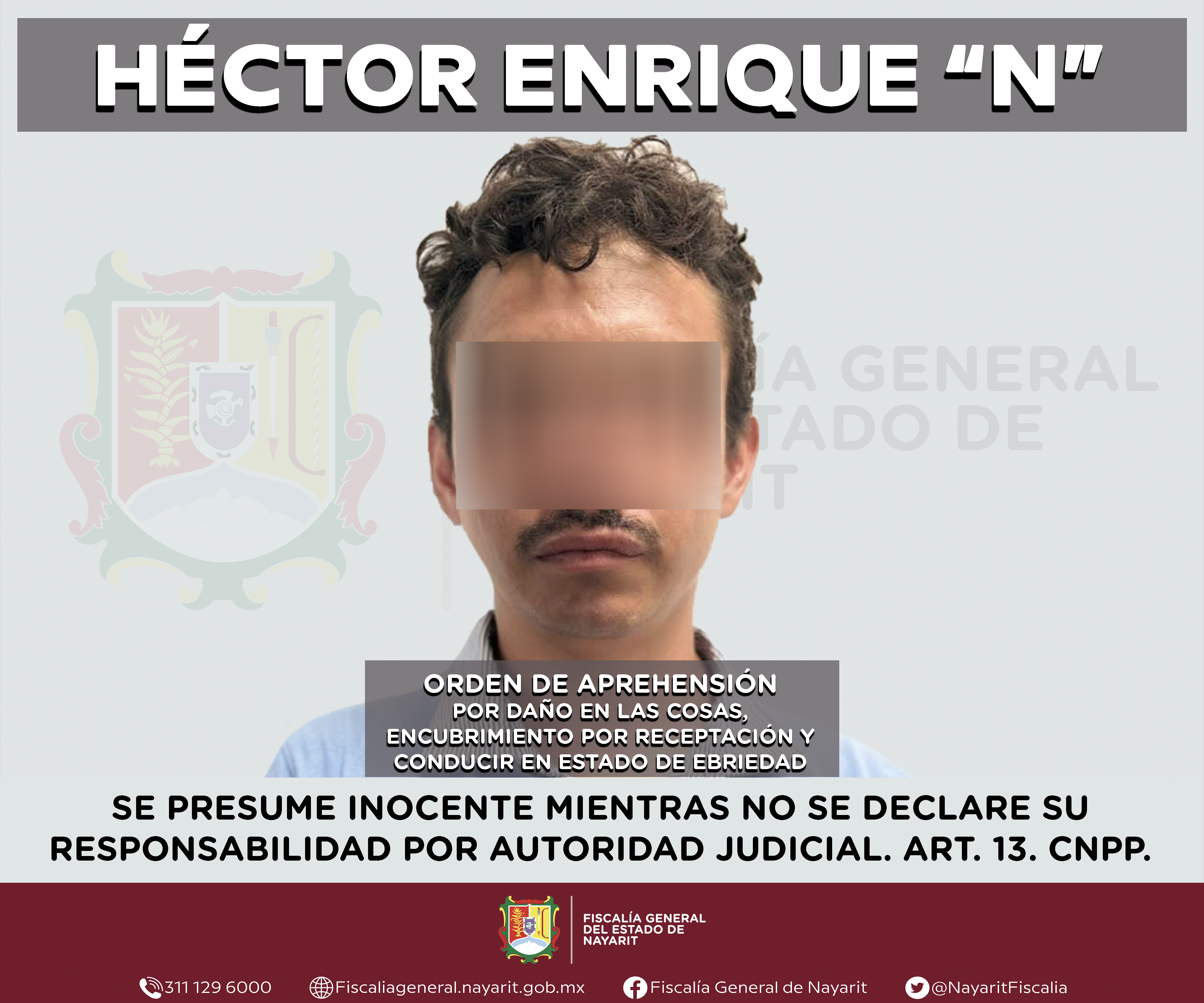 La Fiscalía General del estado de Nayarit informa que elementos de la Agencia de Investigación Criminal ejecutaron una orden de aprehensión contra Héctor Enrique “N”, por su probable participación en hechos que la ley tipifica como delitos de da...
