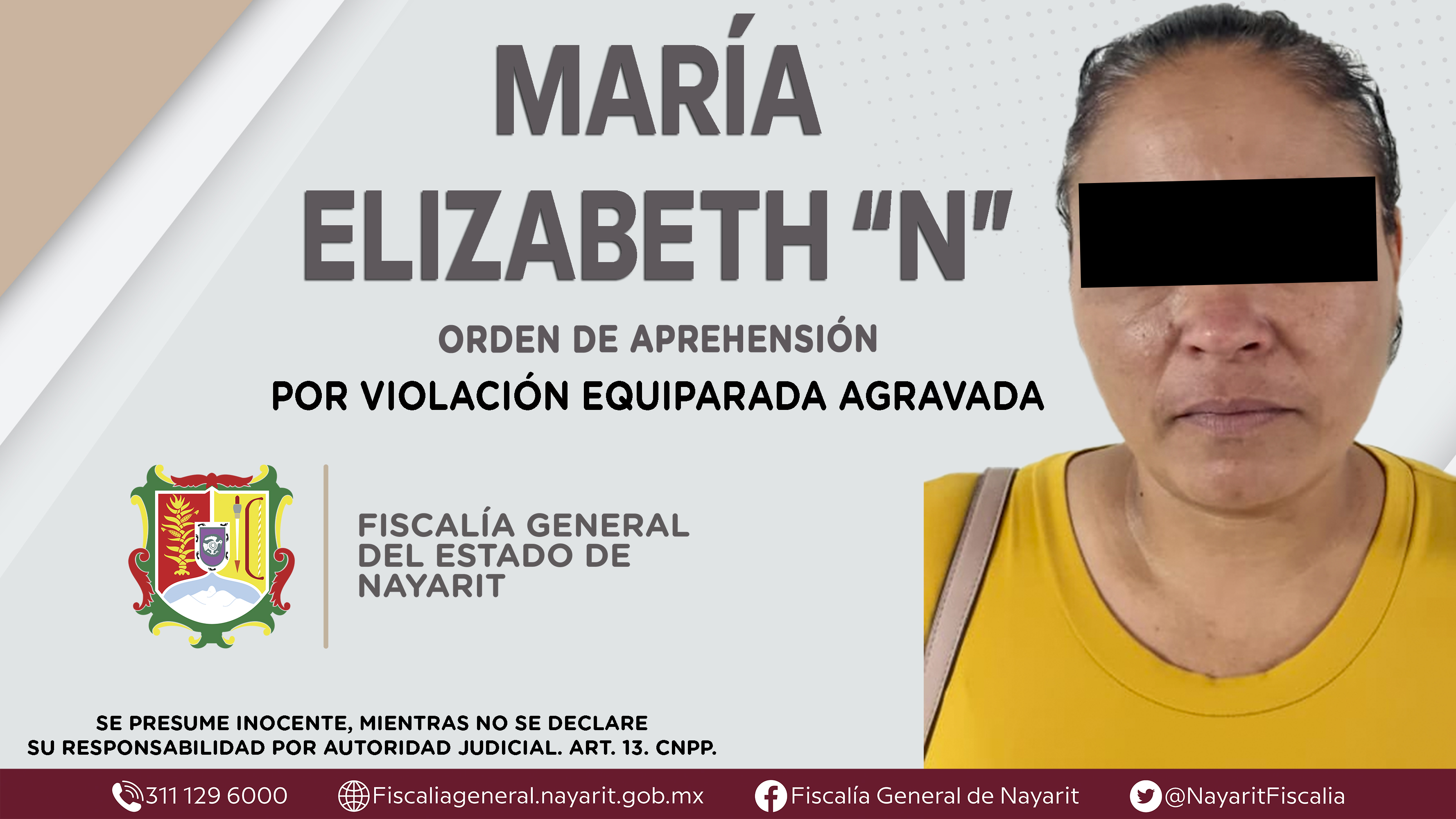 La Fiscalía General del Estado a través de la Agencia de Investigación Criminal dio cumplimiento a una orden de aprehensión en la ciudad de Tepic contra María Elizabeth “N”, por su presunta participación en hechos que según apreciación de la ...