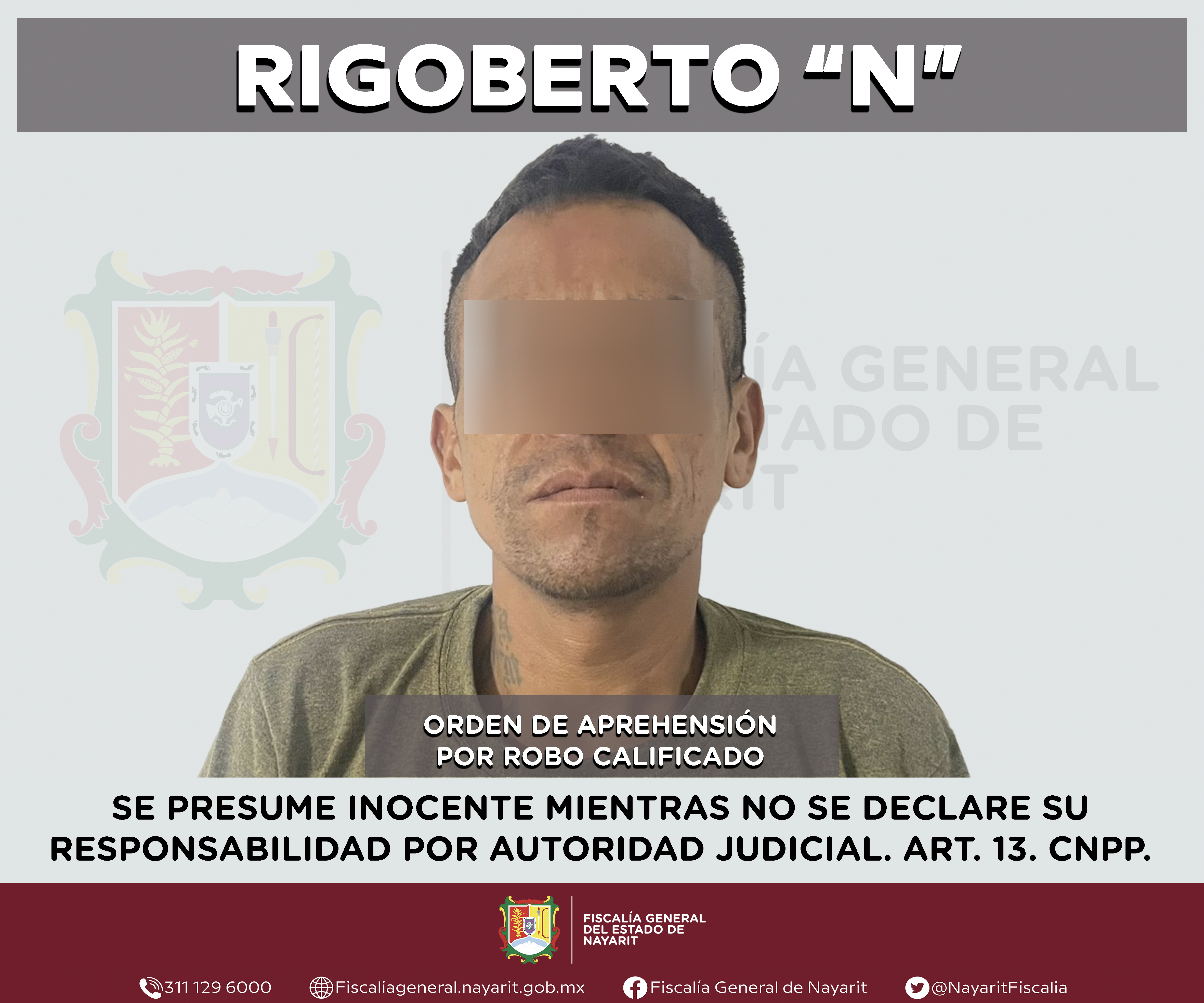 Elementos de la Agencia de Investigación Criminal cumplimentaron una orden de aprehensión en la ciudad de Tepic contra Rigoberto “N”, por su probable participación en hechos que la legislación vigente tipifica como delito de robo calificado, come...