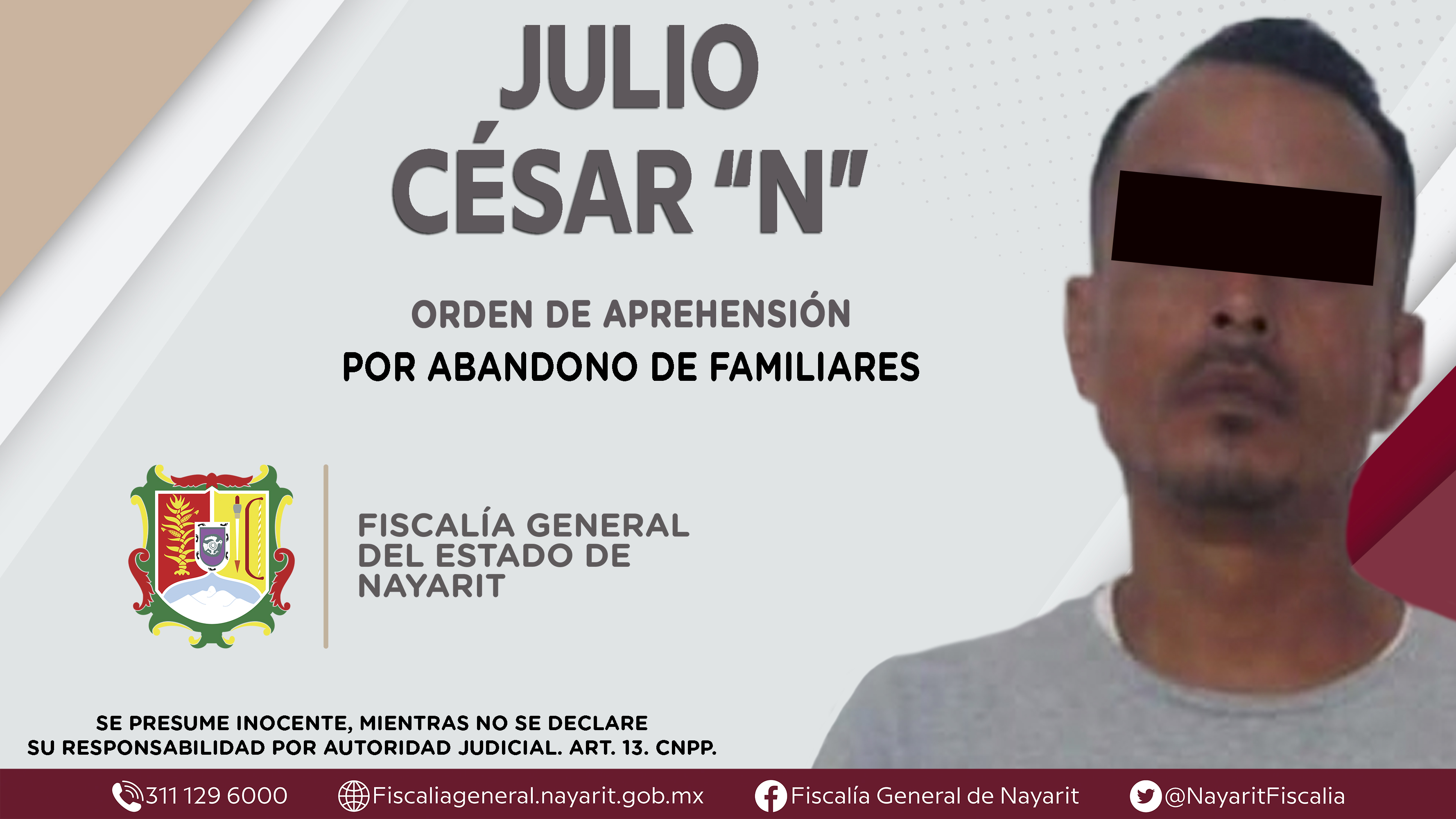 Elementos de la Agencia de Investigación Criminal aprehendieron en el municipio de Compostela a Julio César “N”, por su presunta participación en hechos que la ley juzga como delito de abandono de familiares, cometido en agravio de un menor de eda...