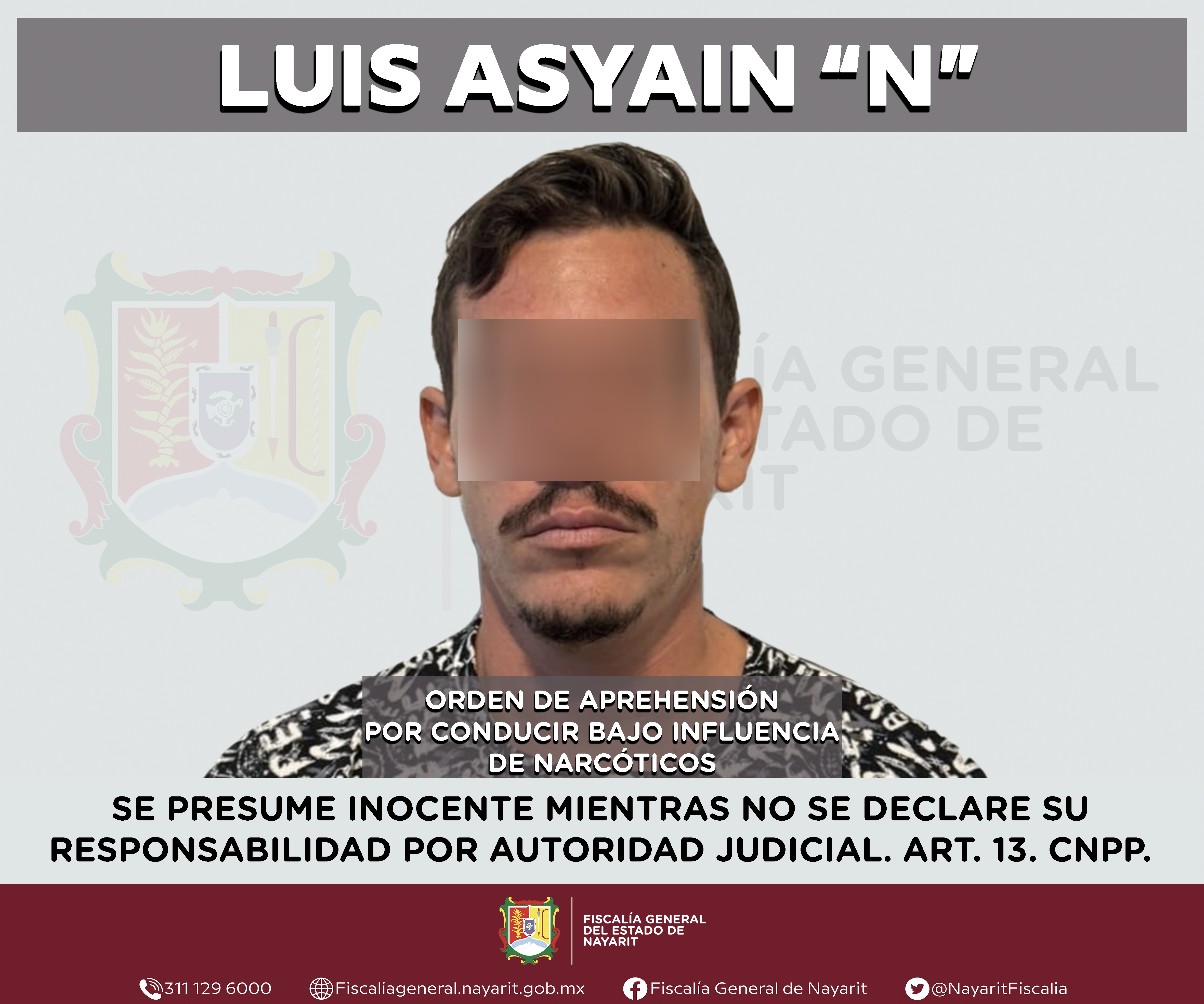 La Fiscalía General del estado de Nayarit informa que elementos de la Agencia de Investigación Criminal ejecutaron una orden de aprehensión en la localidad San Vicente, municipio de Bahía de Banderas contra Luis Asyain “N”, por su presunta partic...