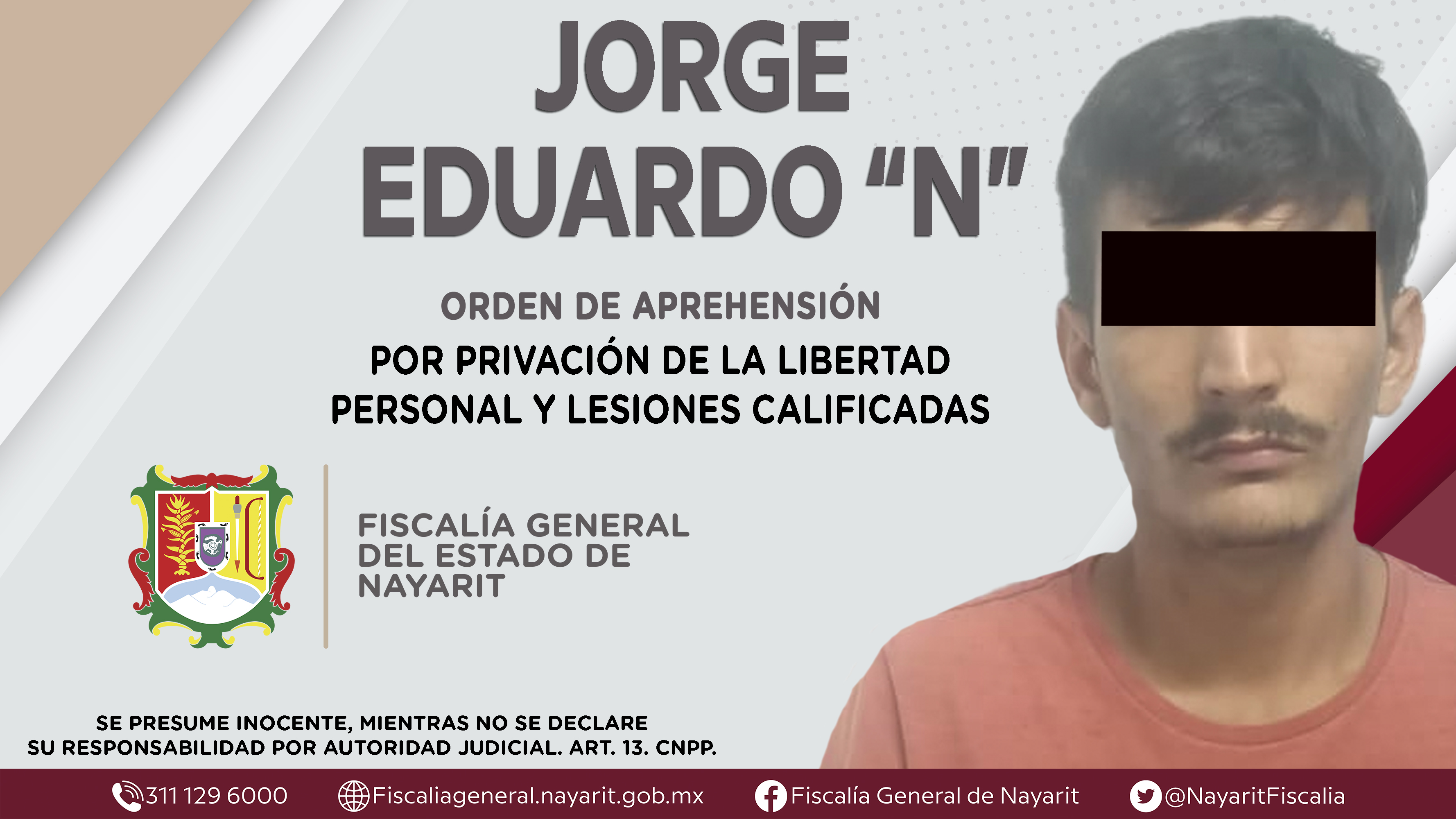 Elementos de la Agencia de Investigación Criminal cumplimentaron una orden de aprehensión en la capital nayarita contra Jorge Eduardo “N”, por su presuntiva responsabilidad penal en hechos que la ley califica como delitos de privación de la libert...