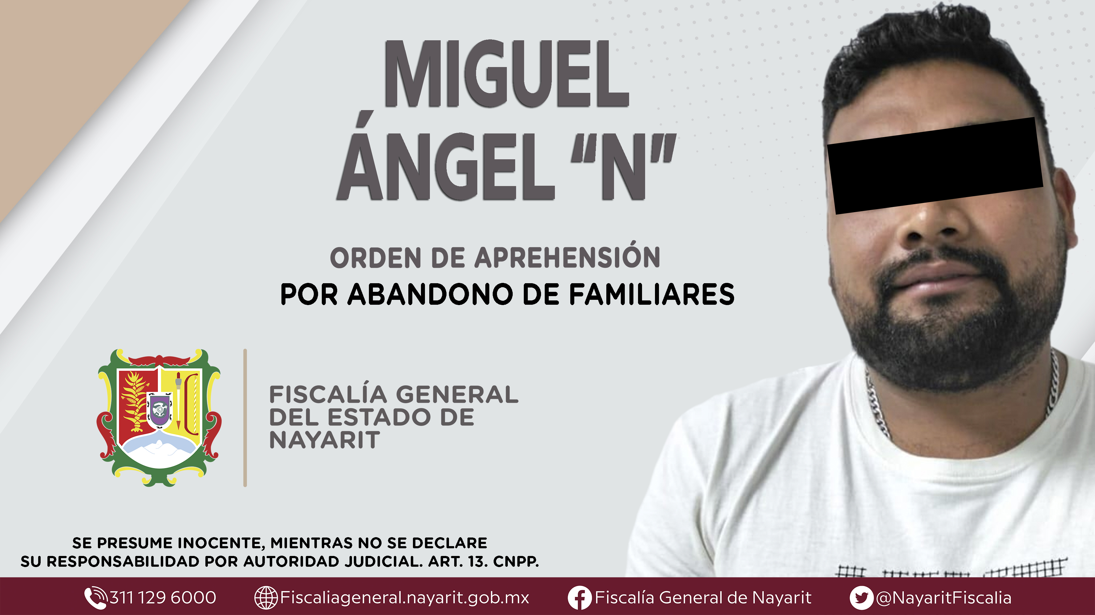 La Fiscalía General del Estado a través de la Agencia de Investigación Criminal dio cumplimiento a una orden de aprehensión en la ciudad de Tepic contra Miguel Ángel “N”, por su presunta participación en hechos que según apreciación de la ley...
