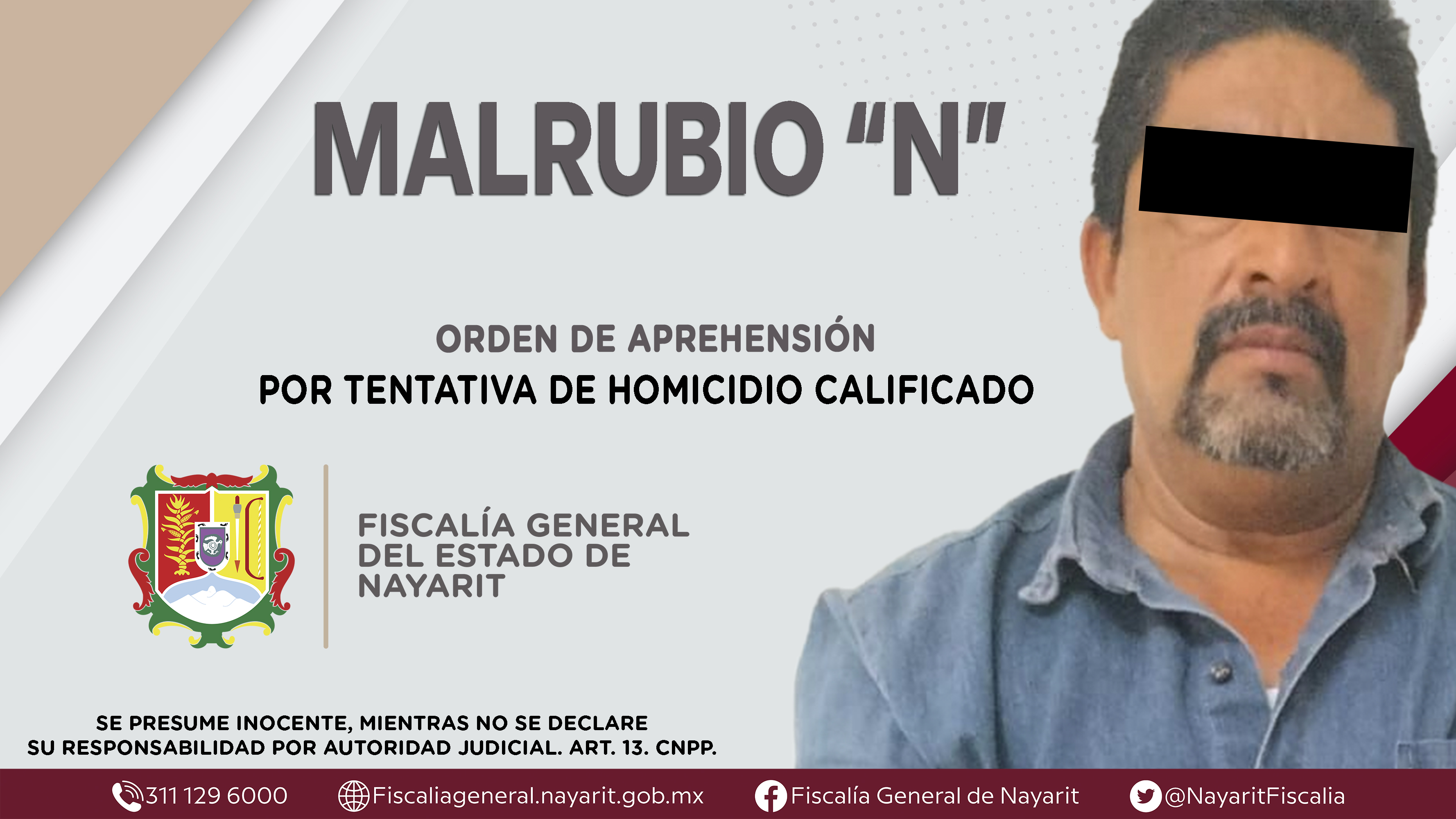 La Fiscalía General de Nayarit a través de la Agencia de Investigación Criminal ejecutó una orden de aprehensión en el municipio de Acaponeta contra Malrubio “N”, originario y vecino del municipio de Tecuala, por su presunta participación en he...