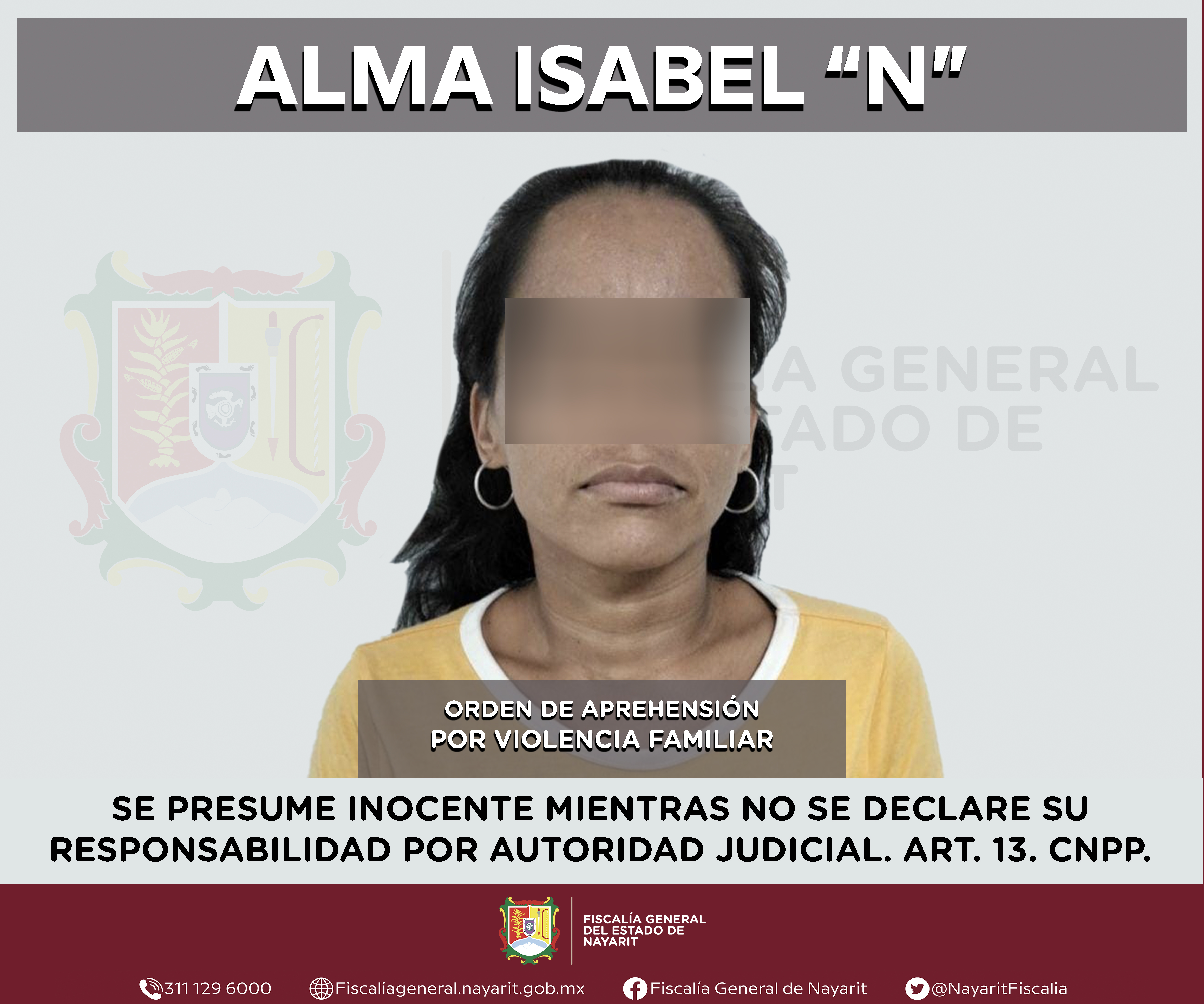 Elementos de la Agencia de Investigación Criminal de Nayarit ejecutaron una orden de aprehensión en la localidad La Cantera, municipio de Tepic contra Alma Isabel “N”, por su presunta participación en hechos que según apreciación de la ley encua...