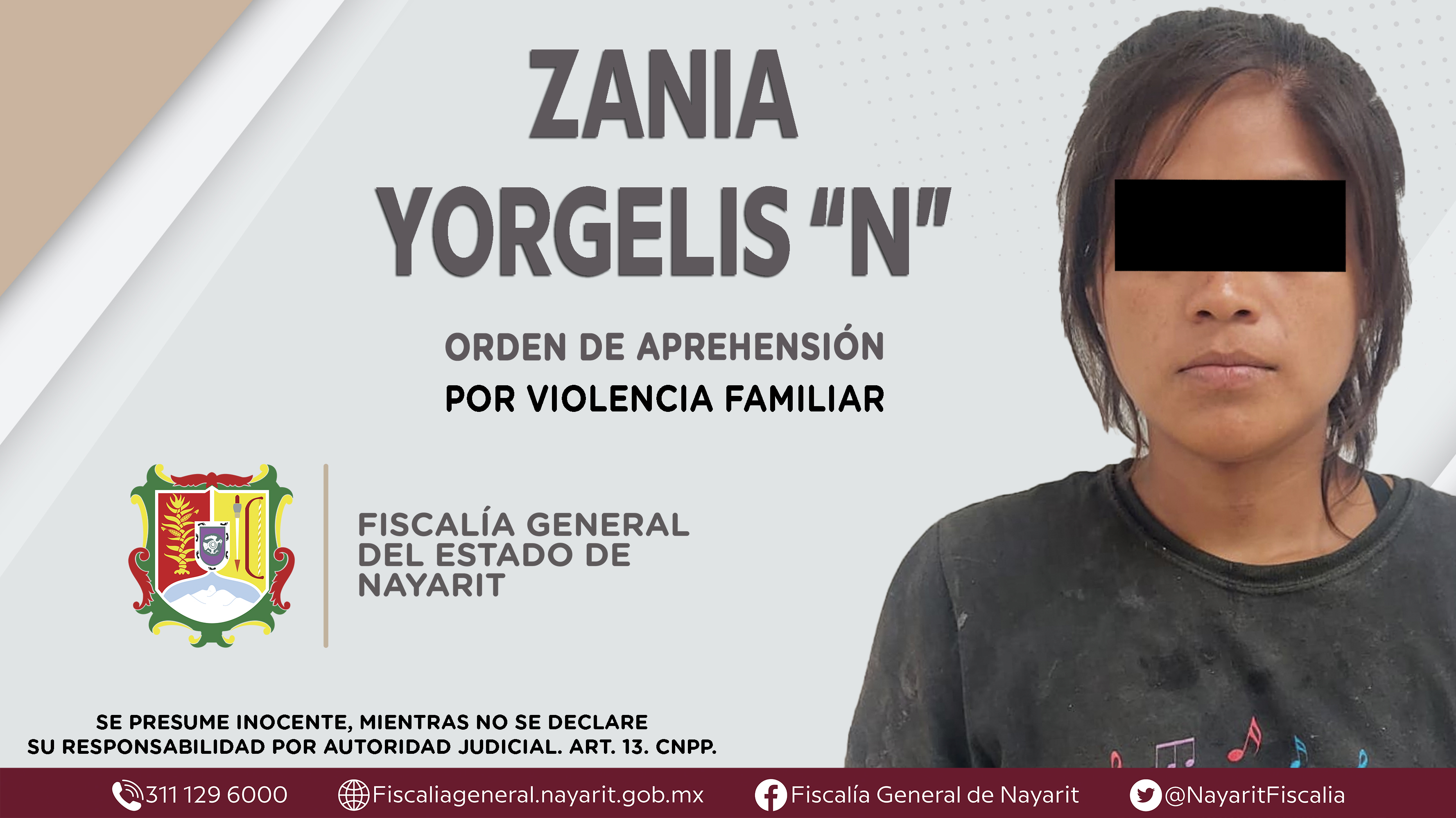 La Fiscalía General del Estado a través de la Agencia de Investigación Criminal dio cumplimiento a una orden de aprehensión en el municipio de Ruiz contra Zania Yorgelis “N”, por su presunta participación en hechos que según apreciación de la ...