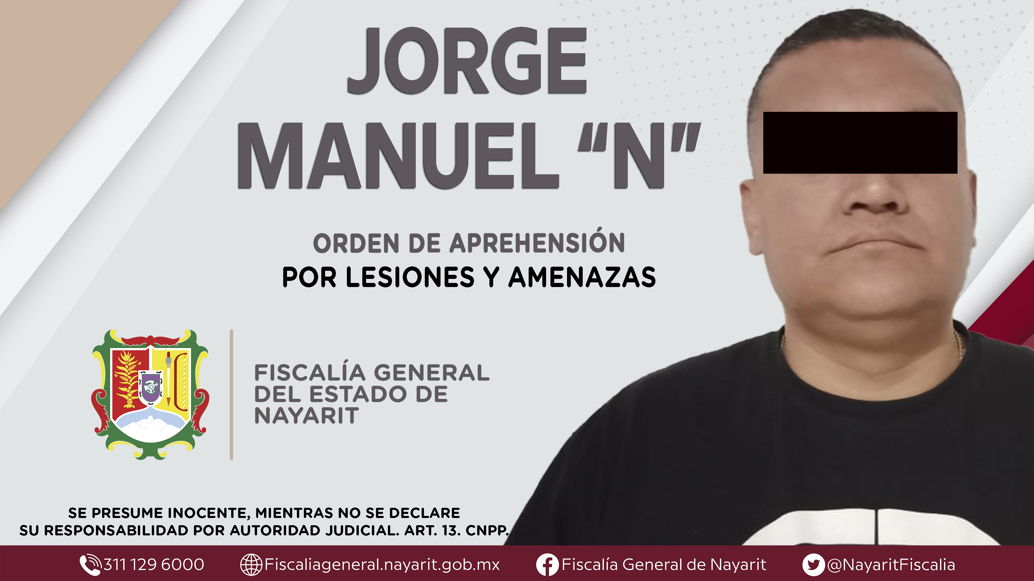 La Fiscalía General del Estado a través de la Agencia de Investigación Criminal dio cumplimiento a una orden de aprehensión en el municipio de Compostela contra Jorge Manuel “N”, quien es originario y vecino de la municipacilidad donde fue deteni...