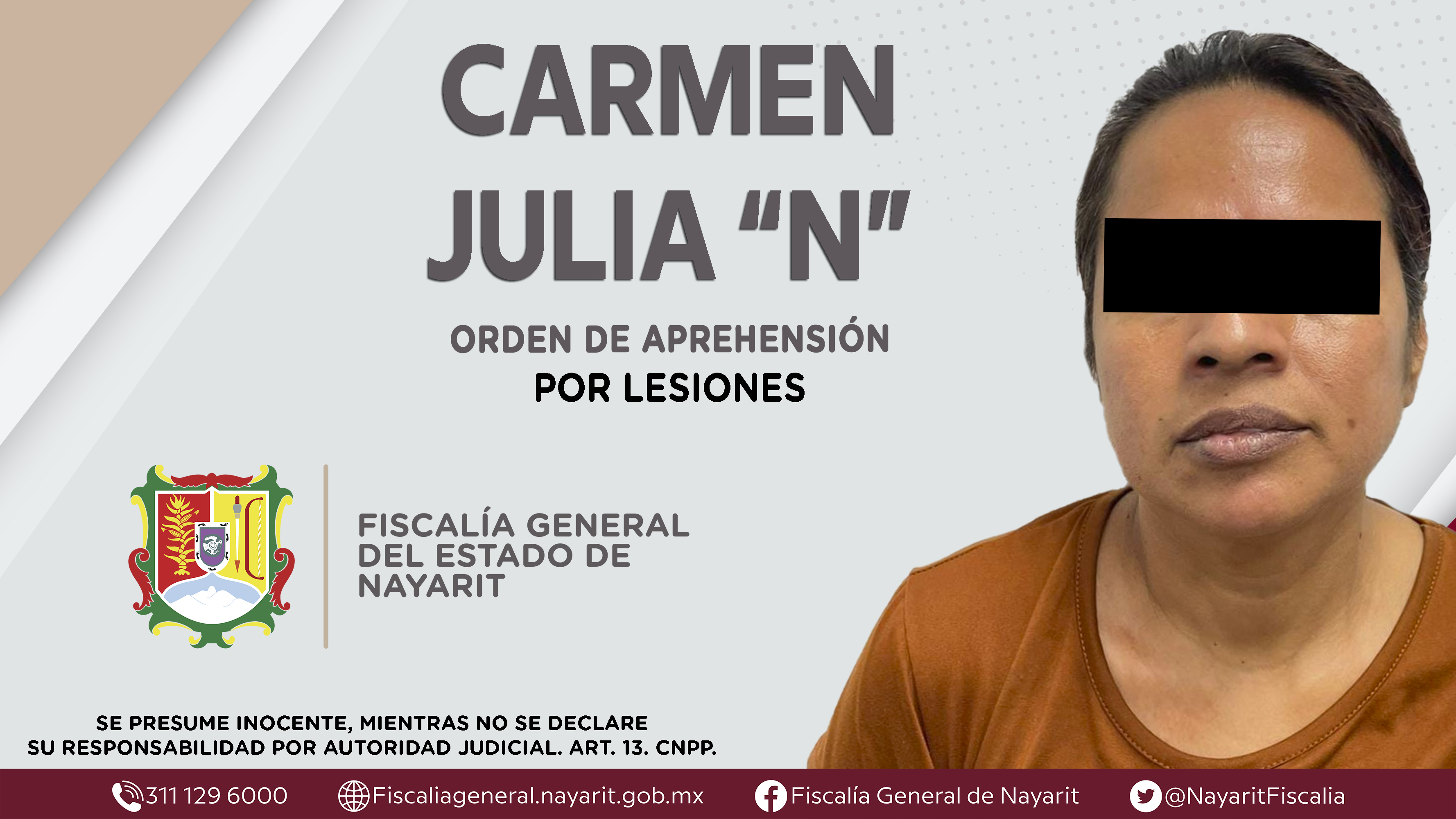 Elementos de la Agencia de Investigación Criminal de Nayarit ejecutaron una orden de aprehensión en la ciudad de Tepic contra Carmen Julia “N”, por su presunta participación en hechos que según apreciación de la ley configuran el delito de lesio...