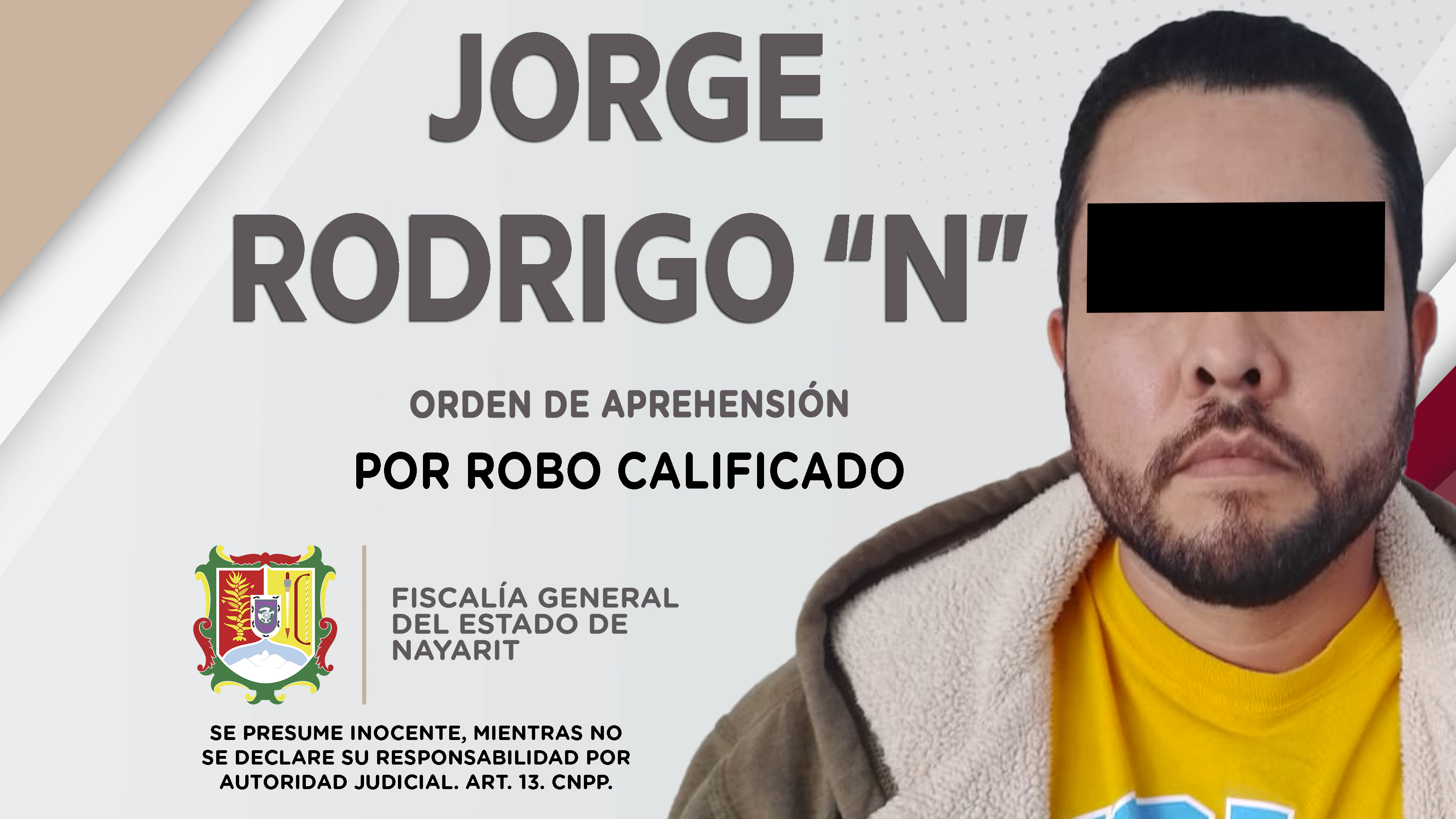 En el municipio de Xalisco, elementos de la Agencia de Investigación Criminal ejecutaron una orden de aprehensión contra Jorge Rodrigo “N”, por su probable responsabilidad penal en hechos que la ley señala como delito de robo calificado, mismo que...