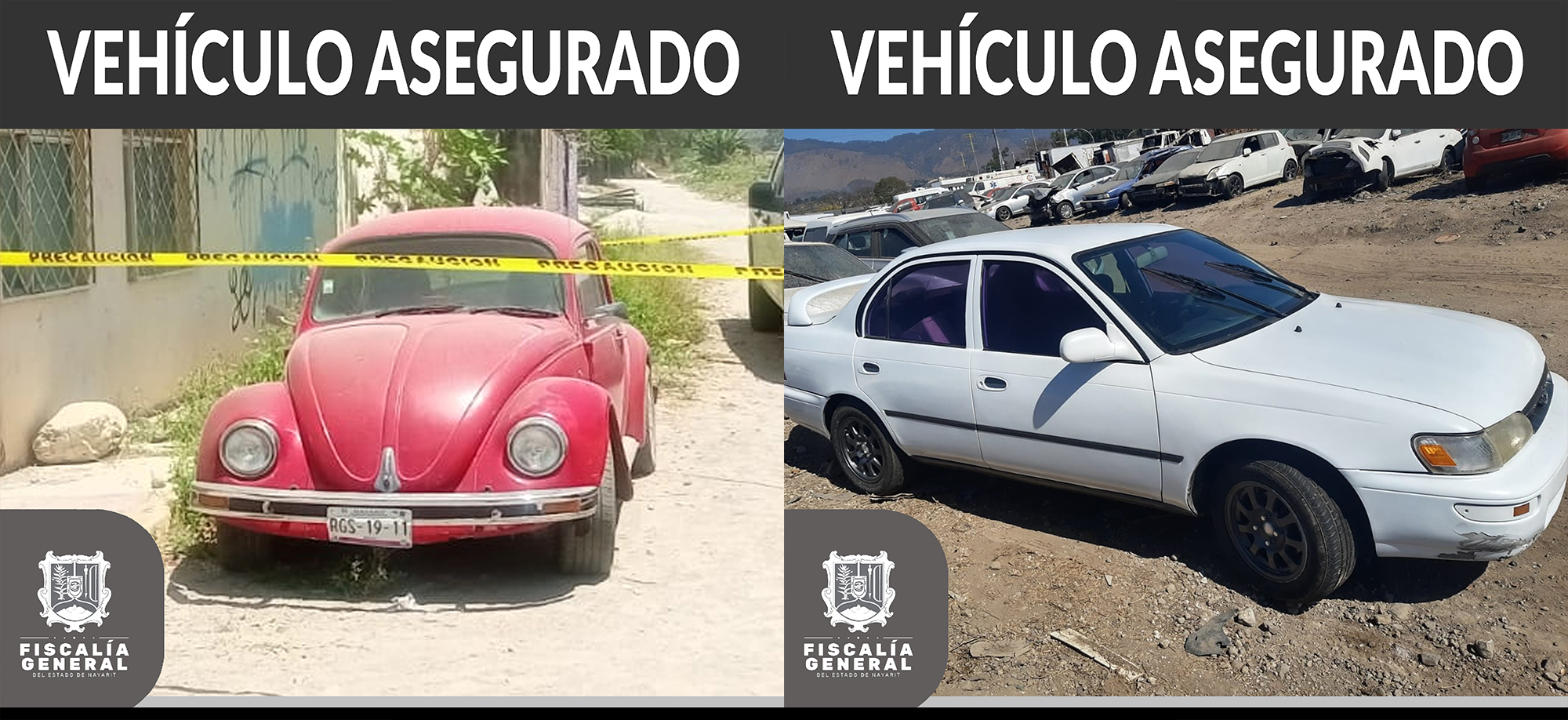 Personal de la Unidad de Robo de Vehículos aseguró dos vehículos en la ciudad de Tepic, la cual cuentan con reporte de robo vigente. La primera unidad es de la marca Toyota, tipo Corolla, modelo 1993, color blanco, con placas de circulación RGD-81-7...