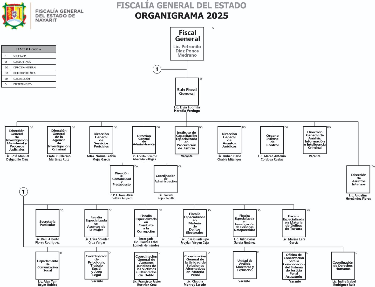 Presentamos el organigrama actualizado de la Fiscalía del Estado, donde se detalla la estructura y distribución de nuestras áreas de trabajo.