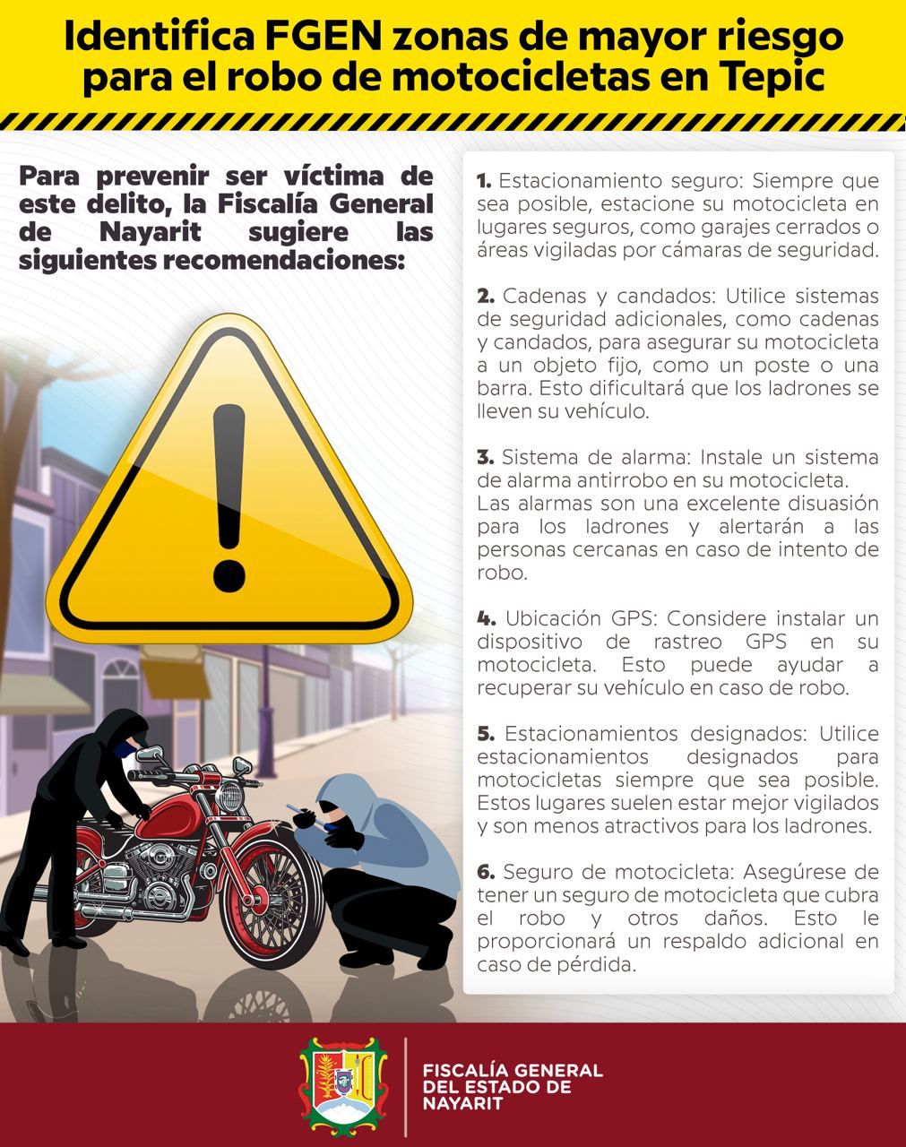 ▪ Este delito tiende a aumentar durante los fines de semana y afecta en su mayoría a motocicletas de la marca Italika\r\n\r\nTepic, Nayarit; 11 de septiembre de 2023.- Derivado de las recientes denuncias relacionadas con el robo de motocicletas en la...
