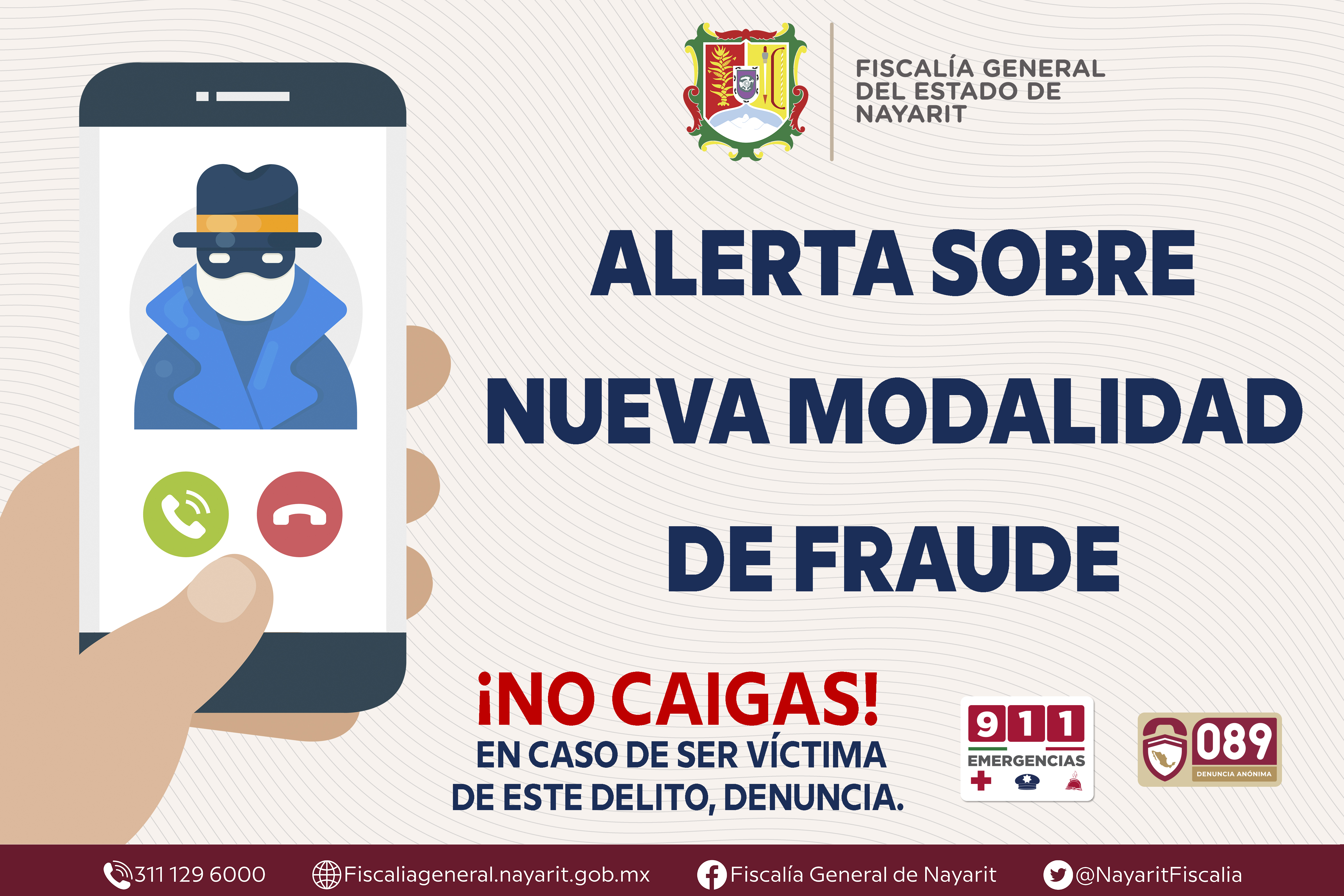 • Se trata de una nueva modalidad de fraude que se viene usando en perjuicio sobre todo de adultos mayores en la ciudad de Tepic\r\n\r\nTepic, Nayarit; miércoles 11 de octubre de 2023.- La Fiscalía General del Estado de Nayarit informa a la sociedad ...