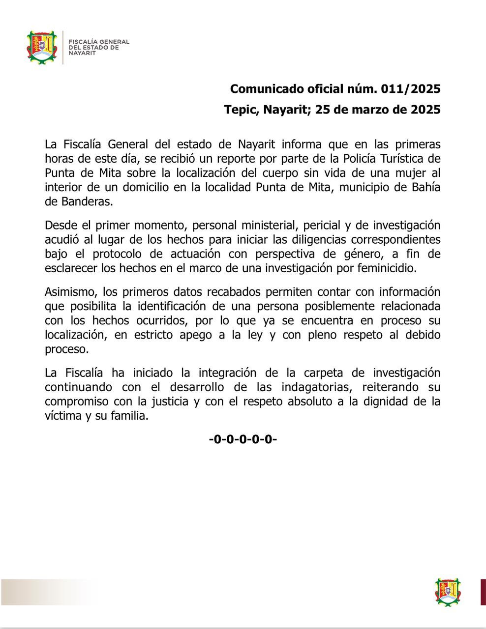 La Fiscalía General del estado de Nayarit informa que en las primeras horas de este día, se recibió un reporte por parte de la Policía Turística de Punta de Mita sobre la localización del cuerpo sin vida de una mujer al interior de un domicilio en ...
