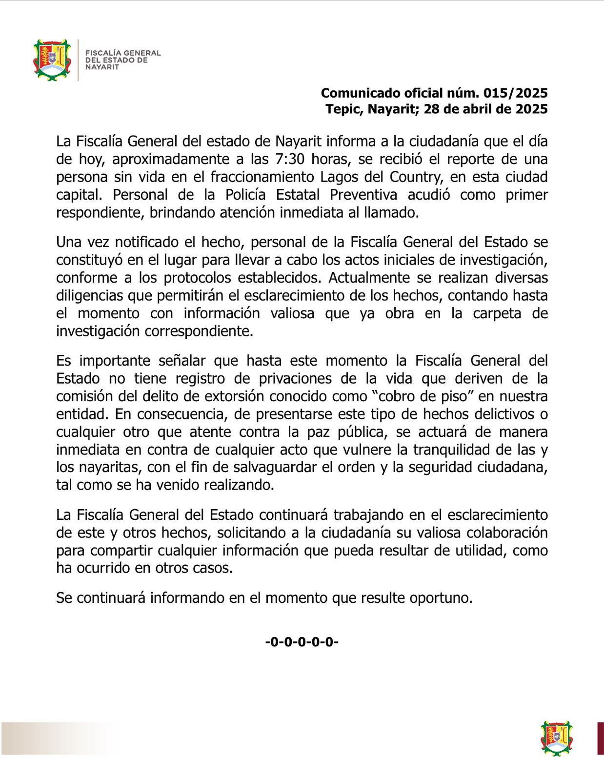 Comunicado oficial núm. 015/2025\r\nTepic, Nayarit; 28 de abril de 2025 \r\n\r\nLa Fiscalía General del estado de Nayarit informa a la ciudadanía que el día de hoy, aproximadamente a las 7:30 horas, se recibió el reporte de una persona sin vida en e...