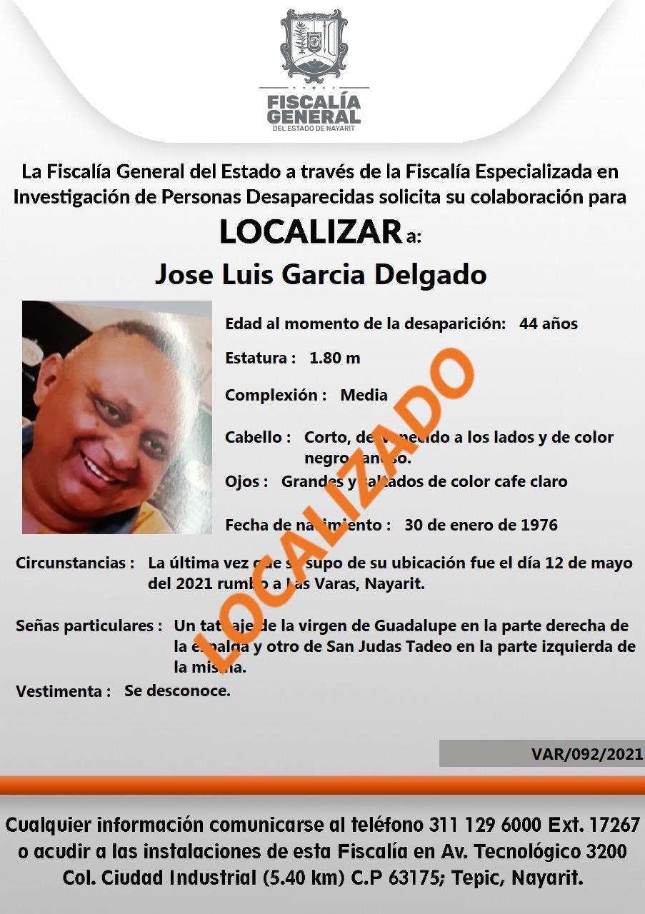 Tepic, Nayarit; 19 de mayo de 2021.- La Fiscalía General del estado de Nayarit a través de la Fiscalía Especializada en Investigación de Personas Desaparecidas, logró localizar a José Luis García Delgado, quien contaba con una denuncia por desapar...
