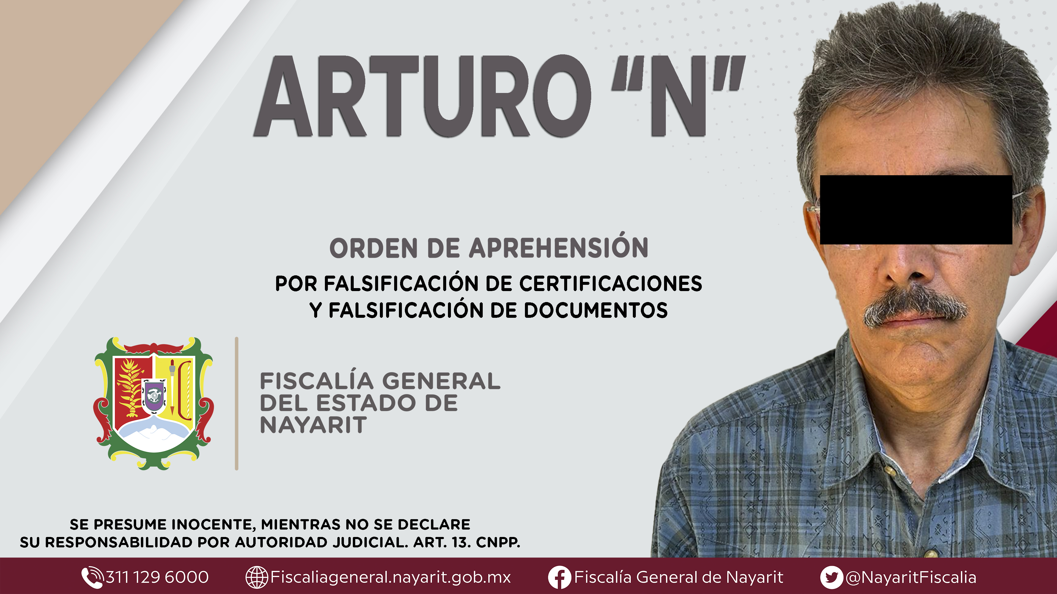 Tepic, Nayarit; 5 de marzo de 2023.- Fiscalía General del estado de Nayarit a través de la Agencia de Investigación Criminal, ejecutó una orden de aprehensión contra Arturo “N” -quien es Notario Público en funciones-, por su probable participac...