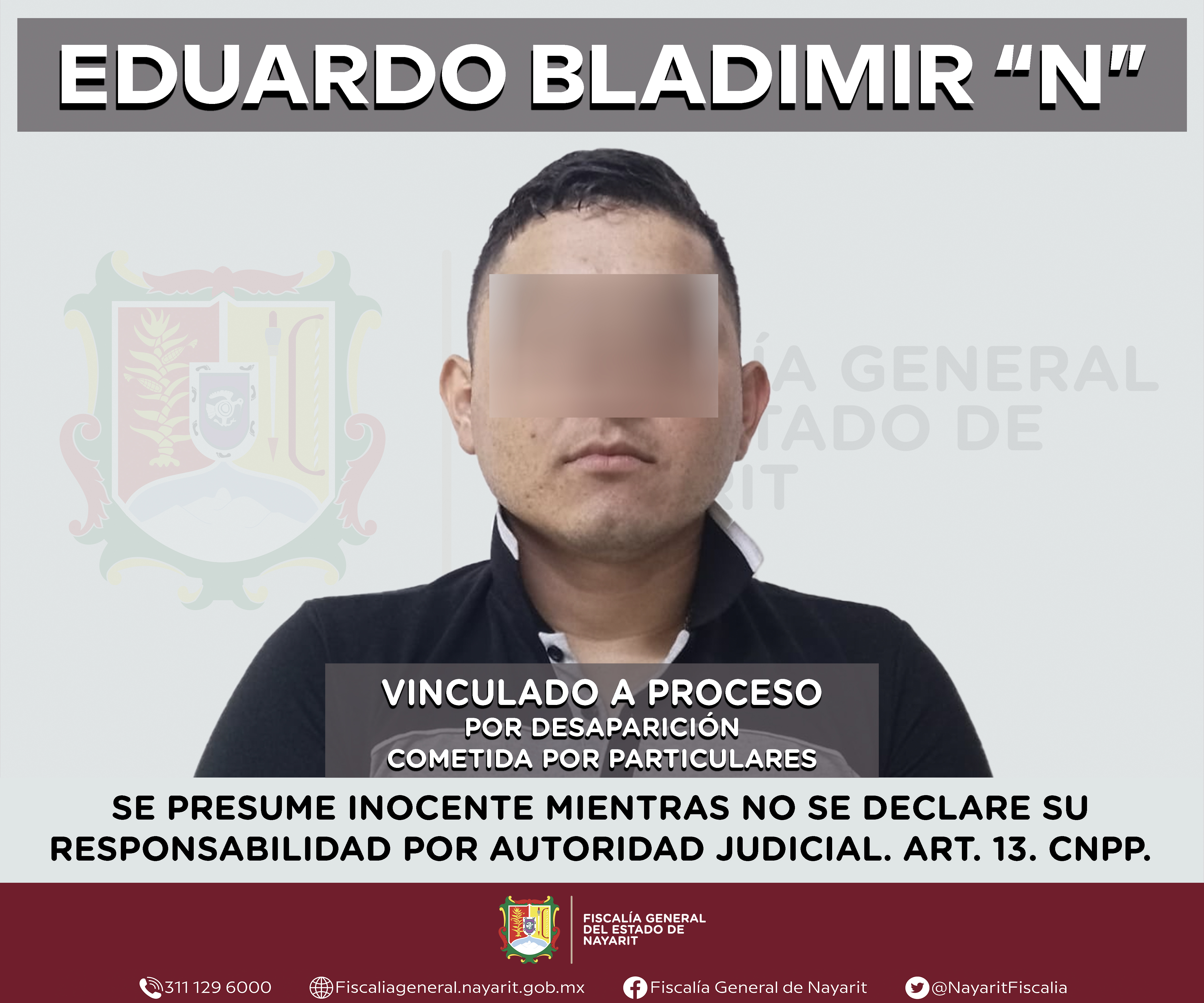 Tepic, Nayarit; 23 de junio de 2025. – La Fiscalía General del estado de Nayarit informa que se dictó auto de vinculación a proceso contra Eduardo Bladimir “N”, por su probable responsabilidad en el delito de desaparición cometida por particula...