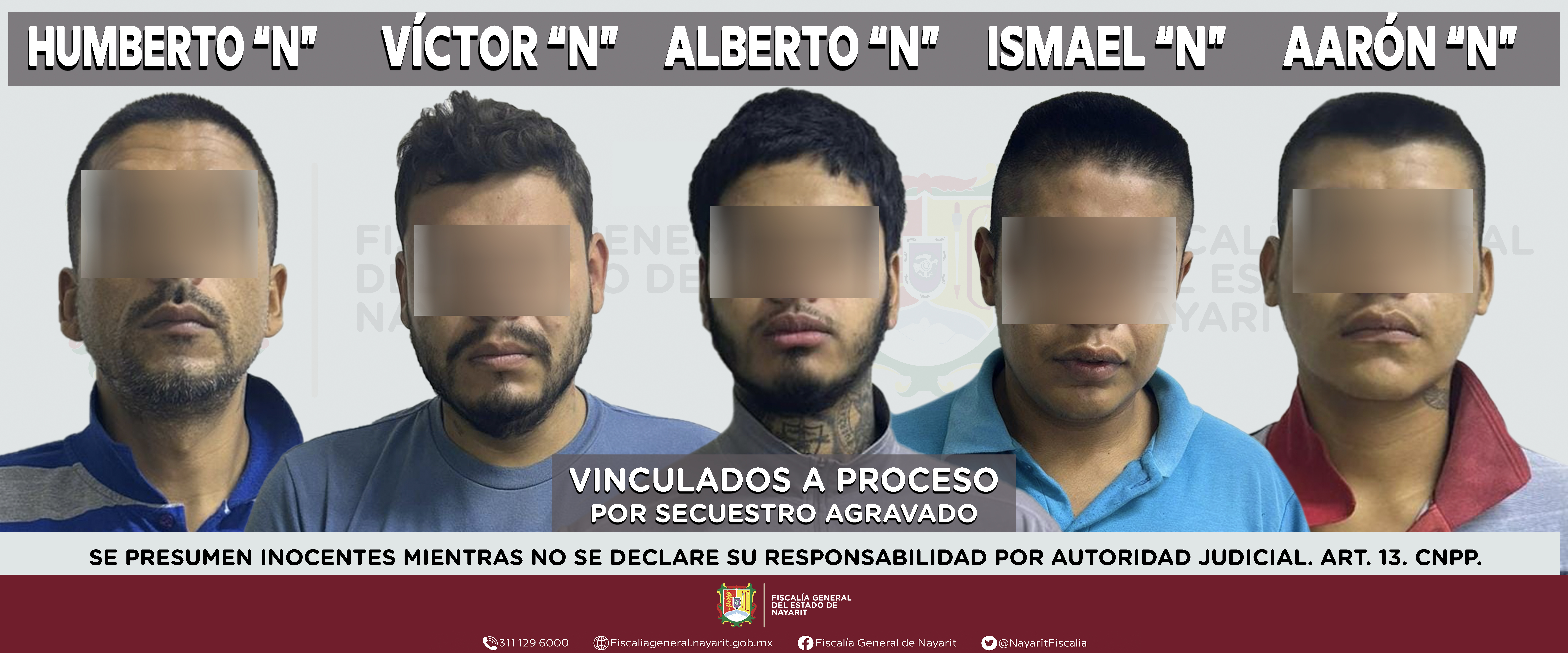 Tepic, Nayarit; 22 de agosto de 2025.- La Fiscalía General del estado de Nayarit informa que un Juez de Control dictó auto de vinculación a proceso contra Cesar Humberto “N”, Ismael “N”, Luis Alberto “N”, Aaron Yahir “N” y Víctor Fran...